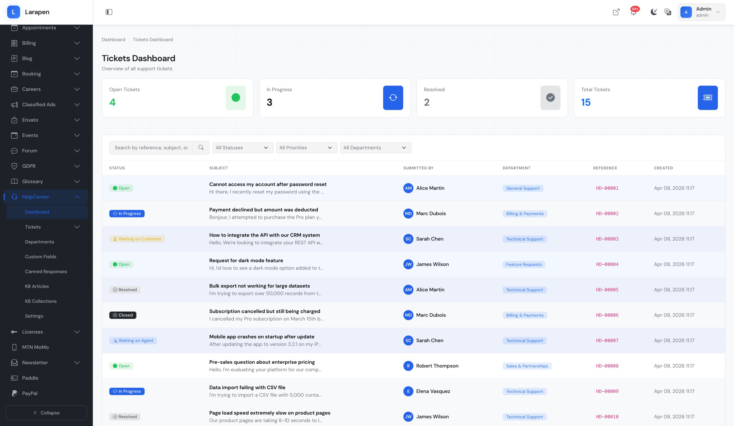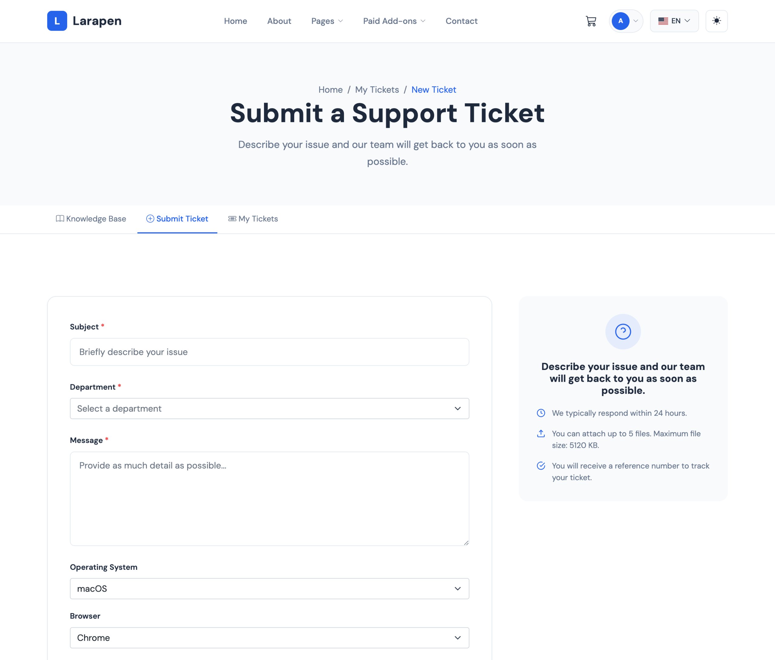 Lorsque le libre-service ne suffit pas, les utilisateurs peuvent soumettre des tickets de support directement depuis le centre d'aide, routés vers le bon département.