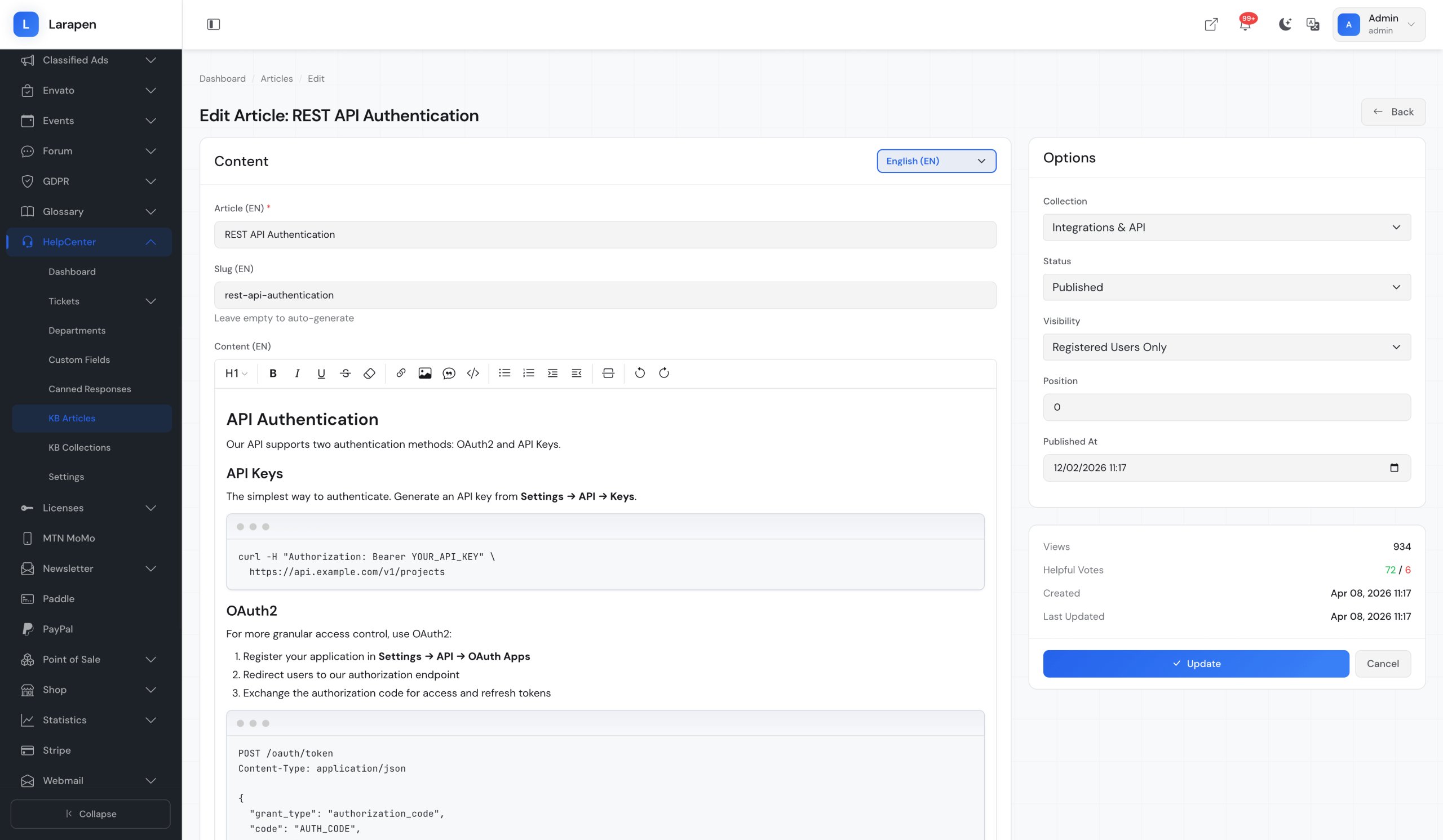 Ajoutez des articles à la base de connaissances avec l'éditeur riche. Assignez-les à des collections et publiez quand vous êtes prêt.