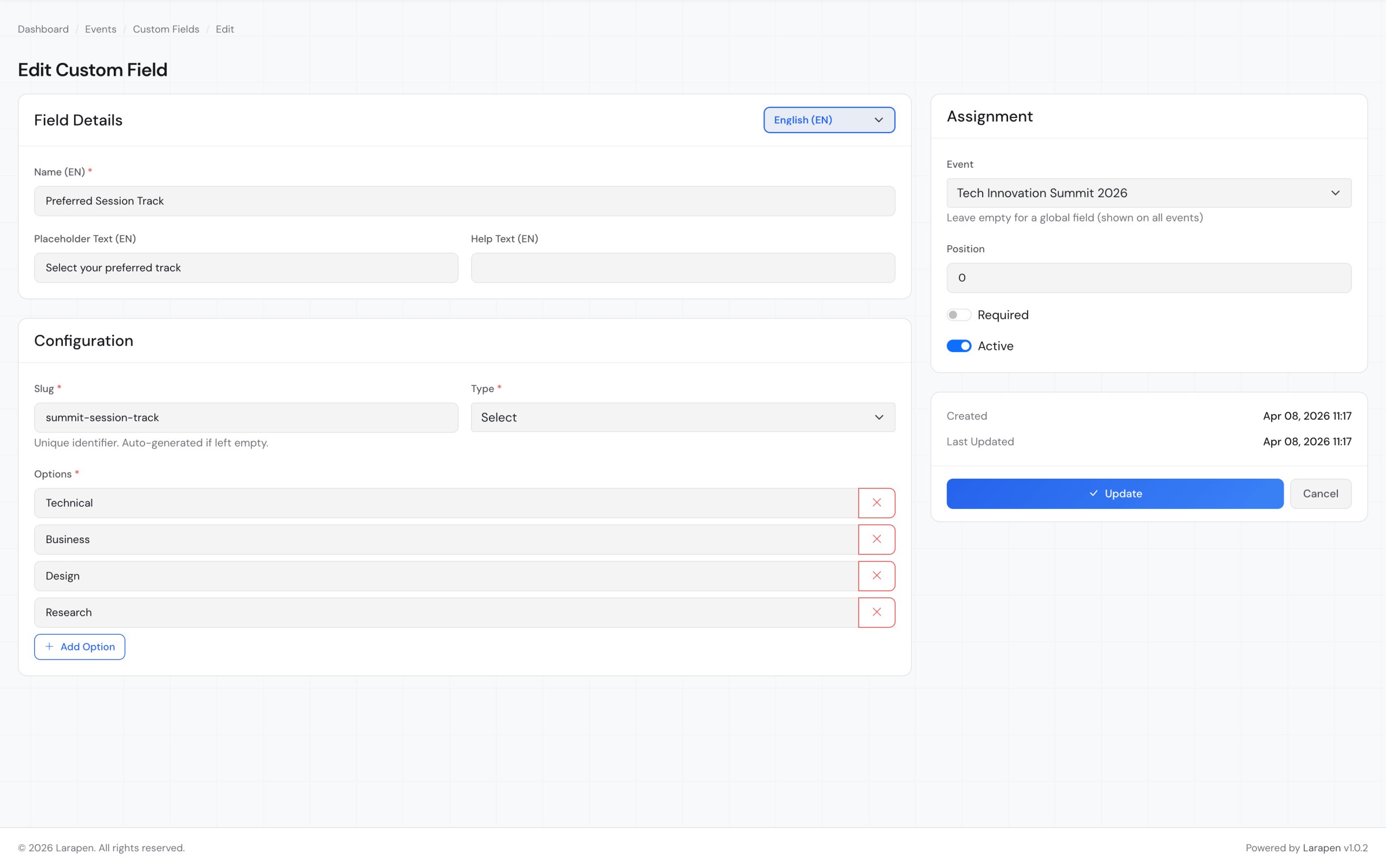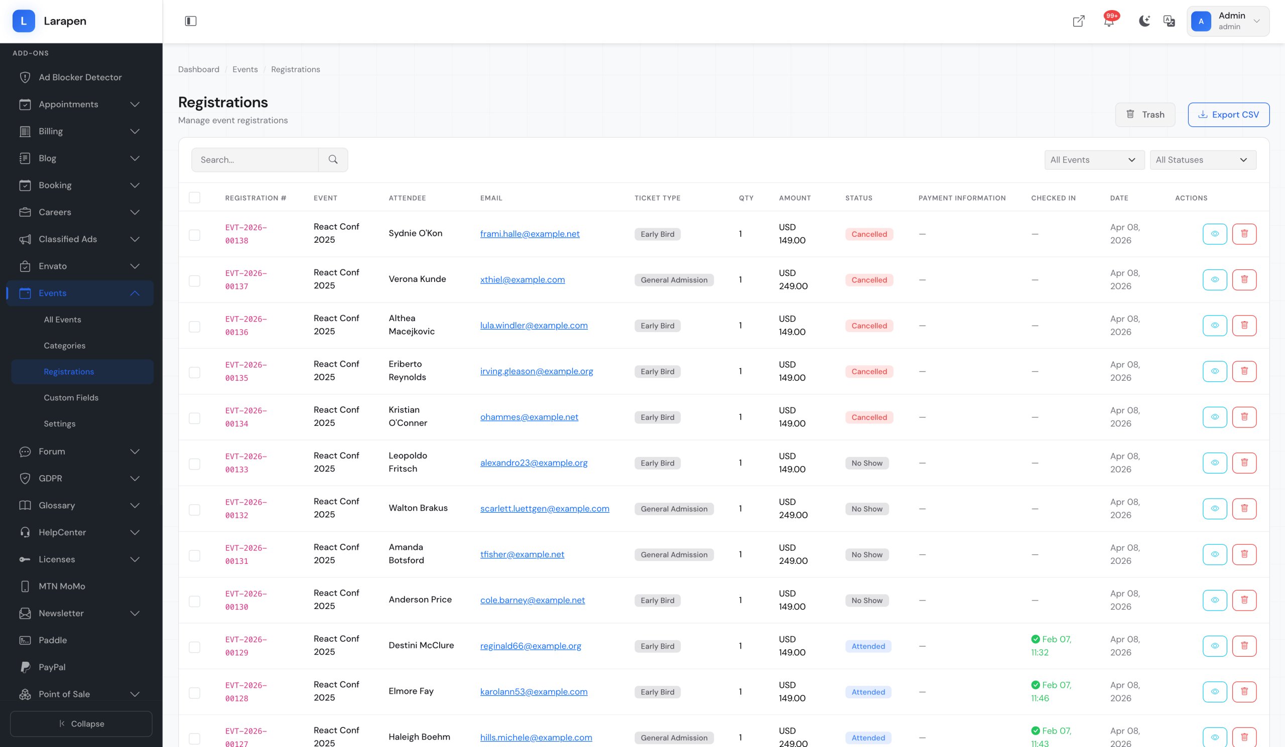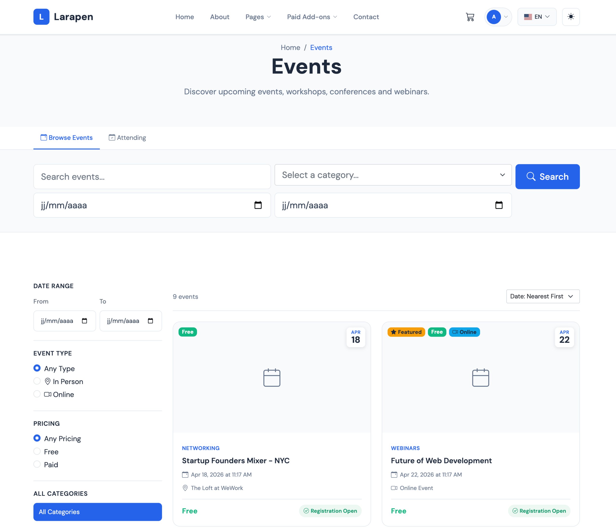 Gérez des événements, conférences et rencontres directement depuis votre site. Créez des événements avec inscription, gestion des billets, vues calendrier et suivi des participants; le tout intégré à votre plateforme Larapen.