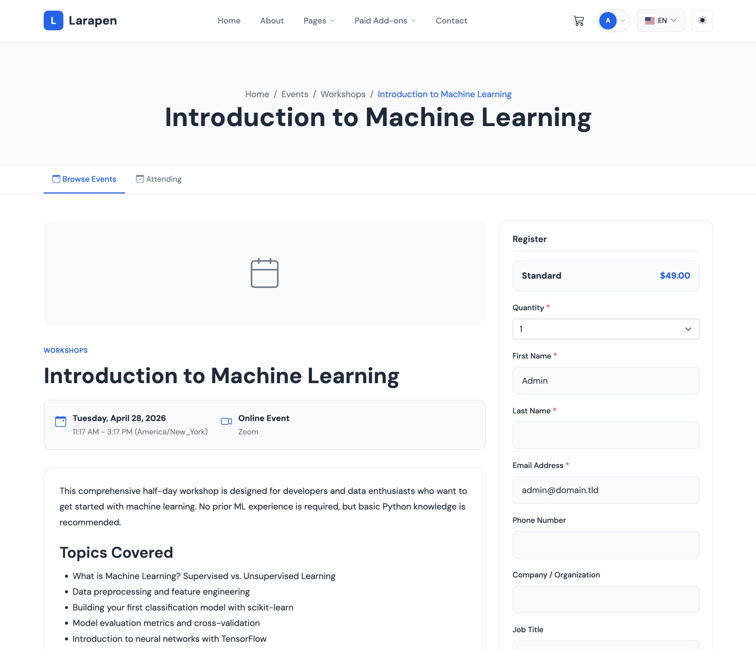 Arrêtez de dépendre de plateformes d'événements tierces qui diluent votre marque. Le module Événements vous permet de publier des listings d'événements directement sur votre site Larapen, avec des descriptions riches, images à la une, détails du lieu et cartes interactives. Les visiteurs s'inscrivent et achètent des billets sans quitter votre site.