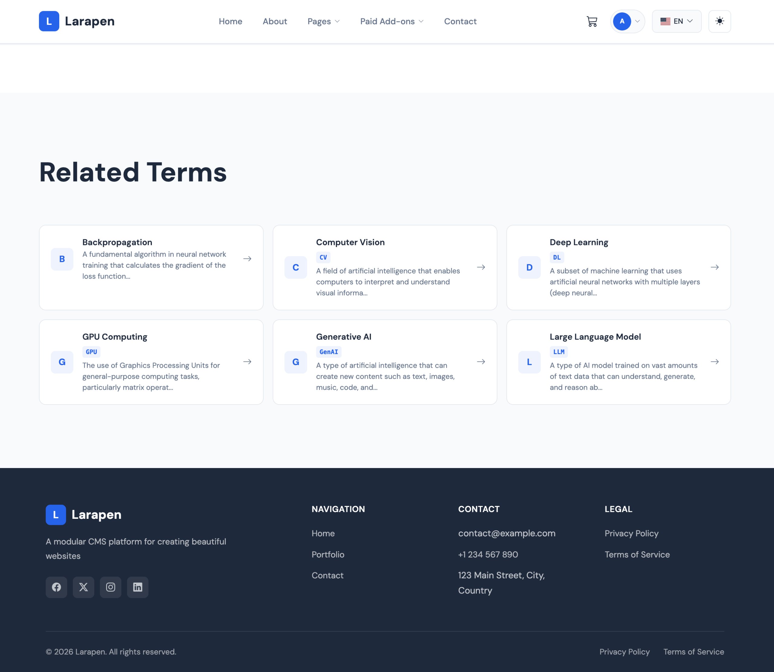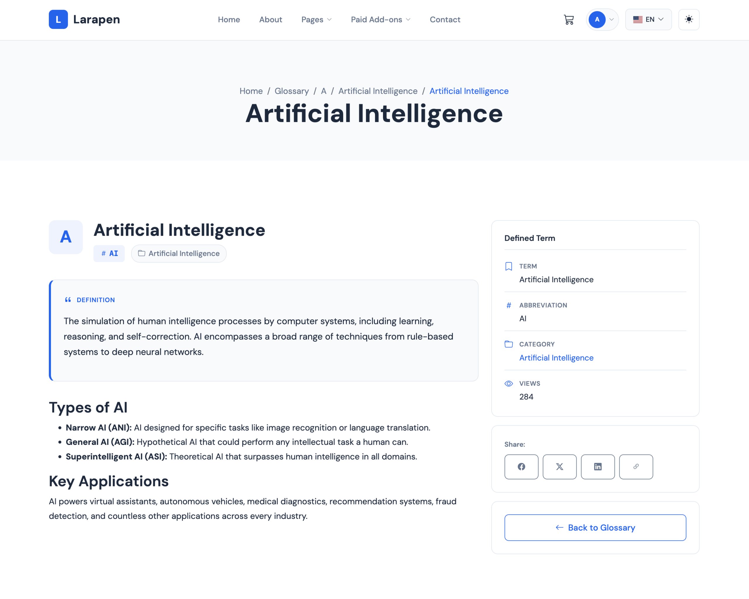 Le module Glossaire vous permet de créer une référence terminologique complète directement sur votre site Larapen. Chaque terme obtient sa propre page dédiée avec une définition riche, en faisant un atout SEO puissant. Les moteurs de recherche adorent le contenu bien structuré et riche en mots-clés, et un glossaire fournit exactement cela. Au fil du temps, vos pages de glossaire attirent du trafic organique.