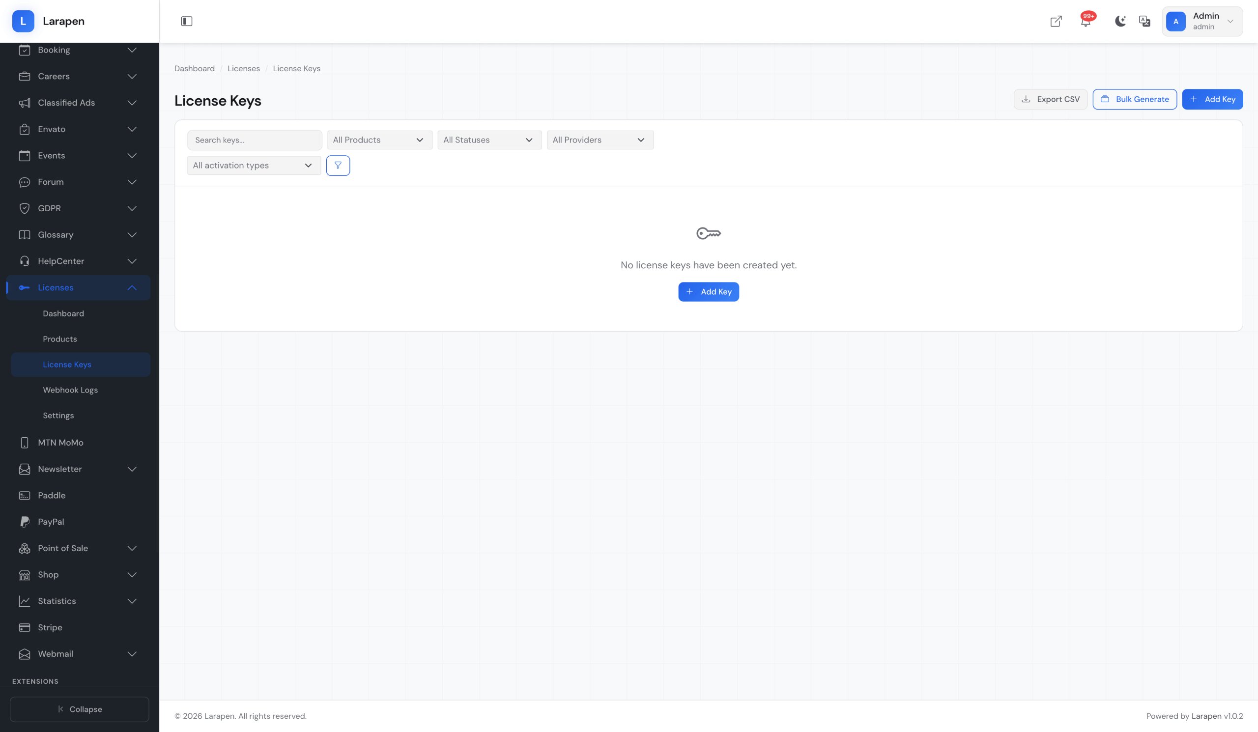 Générez des clés de licence individuellement ou par lots. Les clés peuvent être distribuées manuellement, incluses dans les emails de confirmation d'achat, ou générées automatiquement lorsqu'un client finalise un achat via le module Boutique.