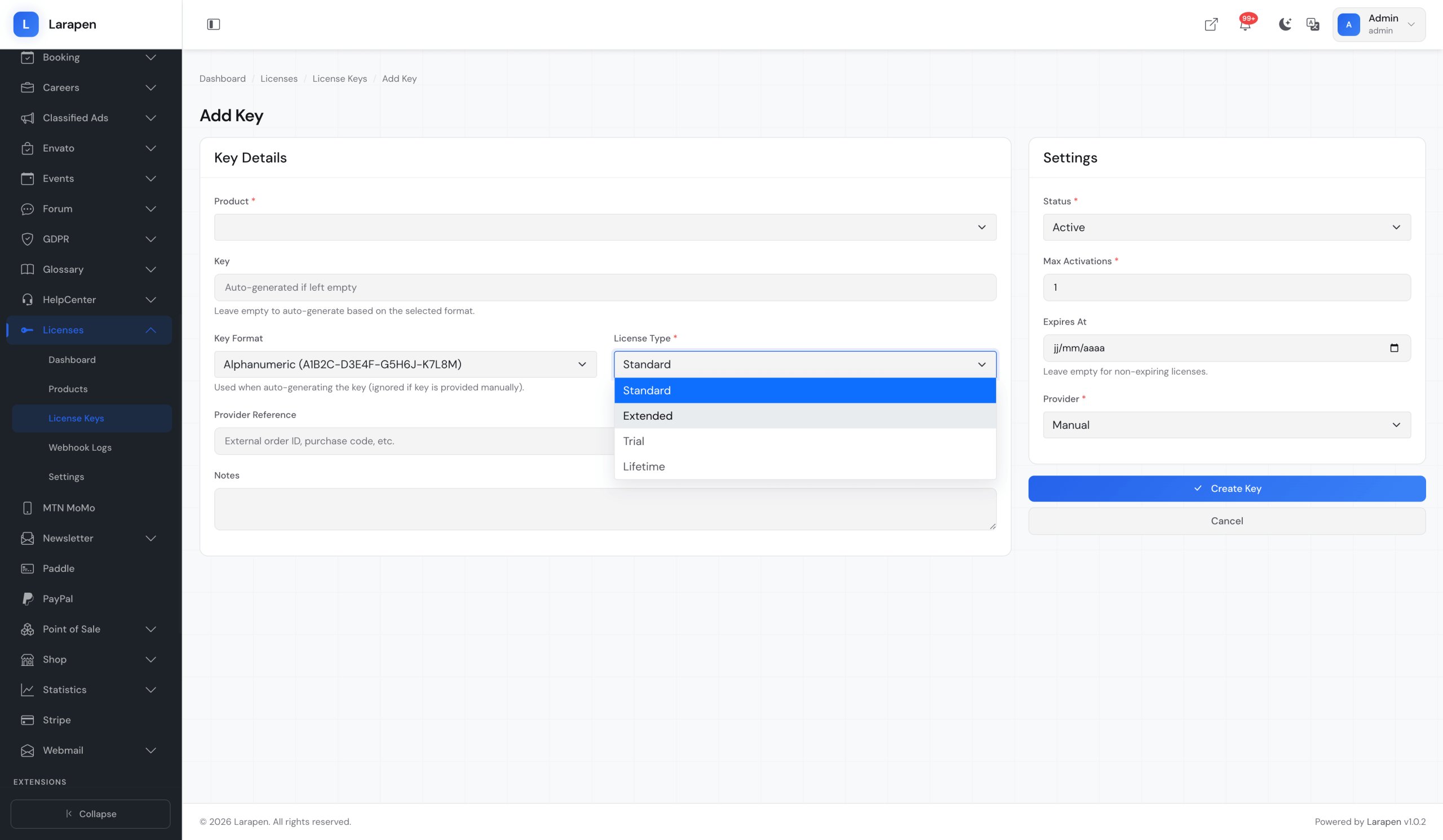 Créez vos produits logiciels et plans de licence dans le panneau d'administration. Définissez le nombre d'activations autorisées, la période de validité et si la liaison au domaine est requise pour chaque plan.