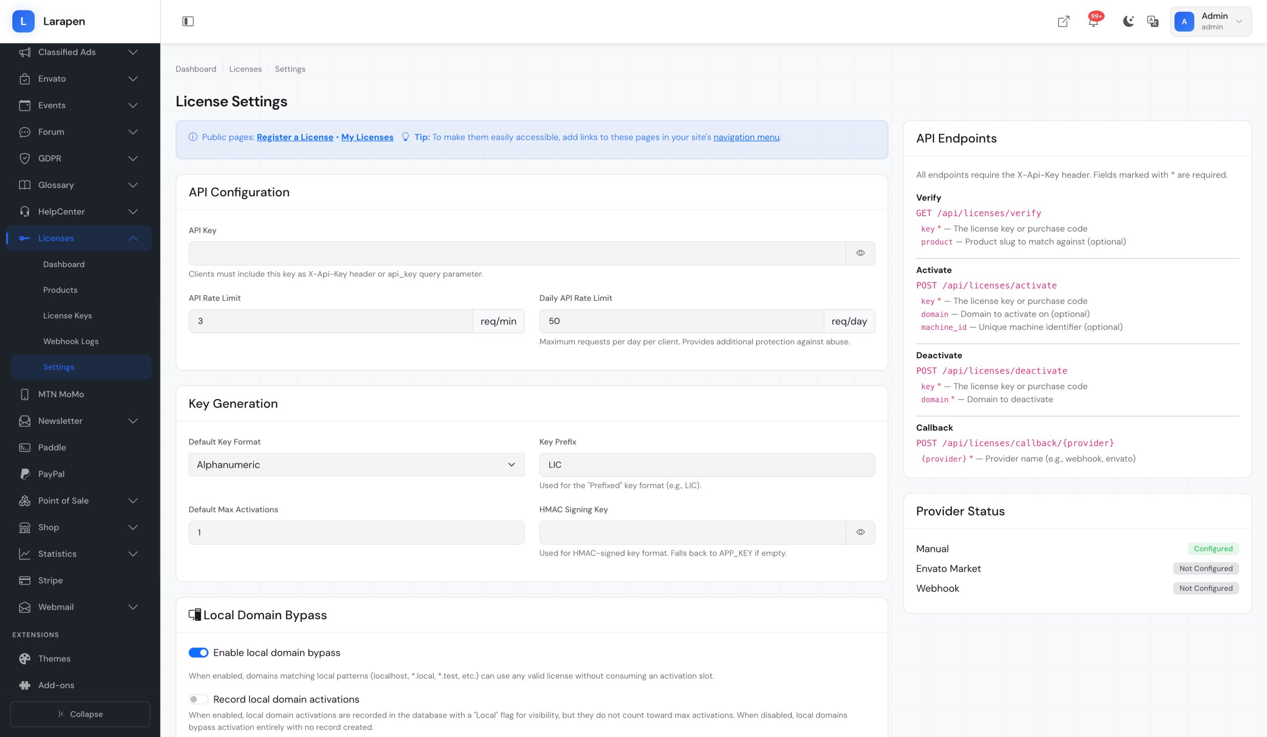 Le module fournit un endpoint API REST sécurisé que votre logiciel distribué peut appeler pour valider les clés de licence. Chaque requête de validation vérifie la validité de la clé, le statut d'activation, la liaison au domaine et l'expiration; retournant une réponse claire sur laquelle votre application peut agir. L'API prend en charge la vérification de signature HMAC pour empêcher la falsification, la limitation du débit pour bloquer les abus, et une journalisation détaillée pour que vous puissiez voir exactement comment et quand chaque licence est utilisée dans votre base clients.