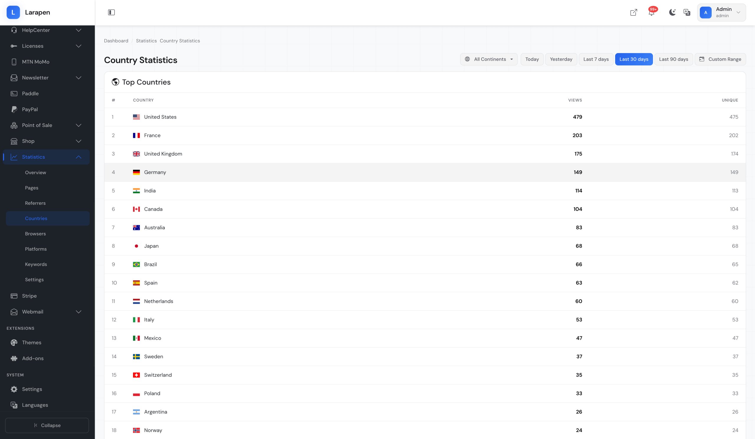 La plupart des outils d'analyse envoient les données de vos visiteurs à des serveurs externes appartenant à des entreprises de technologie publicitaire. Le module Stats de Larapen adopte une approche différente : toutes les données restent sur votre propre serveur. Vous obtenez les informations dont vous avez besoin: pages vues, visiteurs uniques, sources de trafic, contenu populaire et répartition des appareils; sans donner les données de votre audience à des tiers. Pas de cookies de suivi, pas de suivi inter-sites, pas de bannière de consentement requise dans la plupart des juridictions. Juste des métriques propres et utiles stockées dans votre propre base de données.
