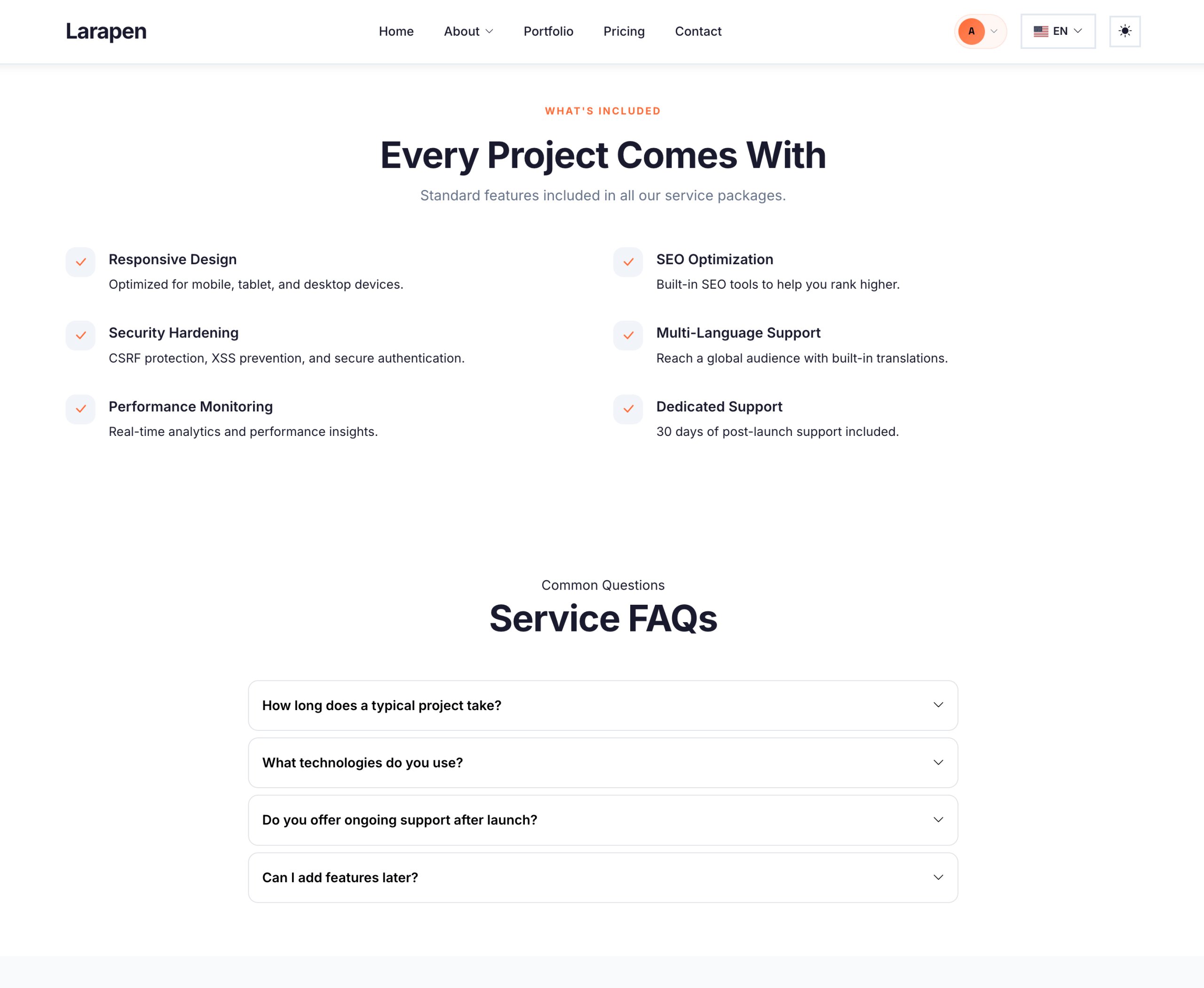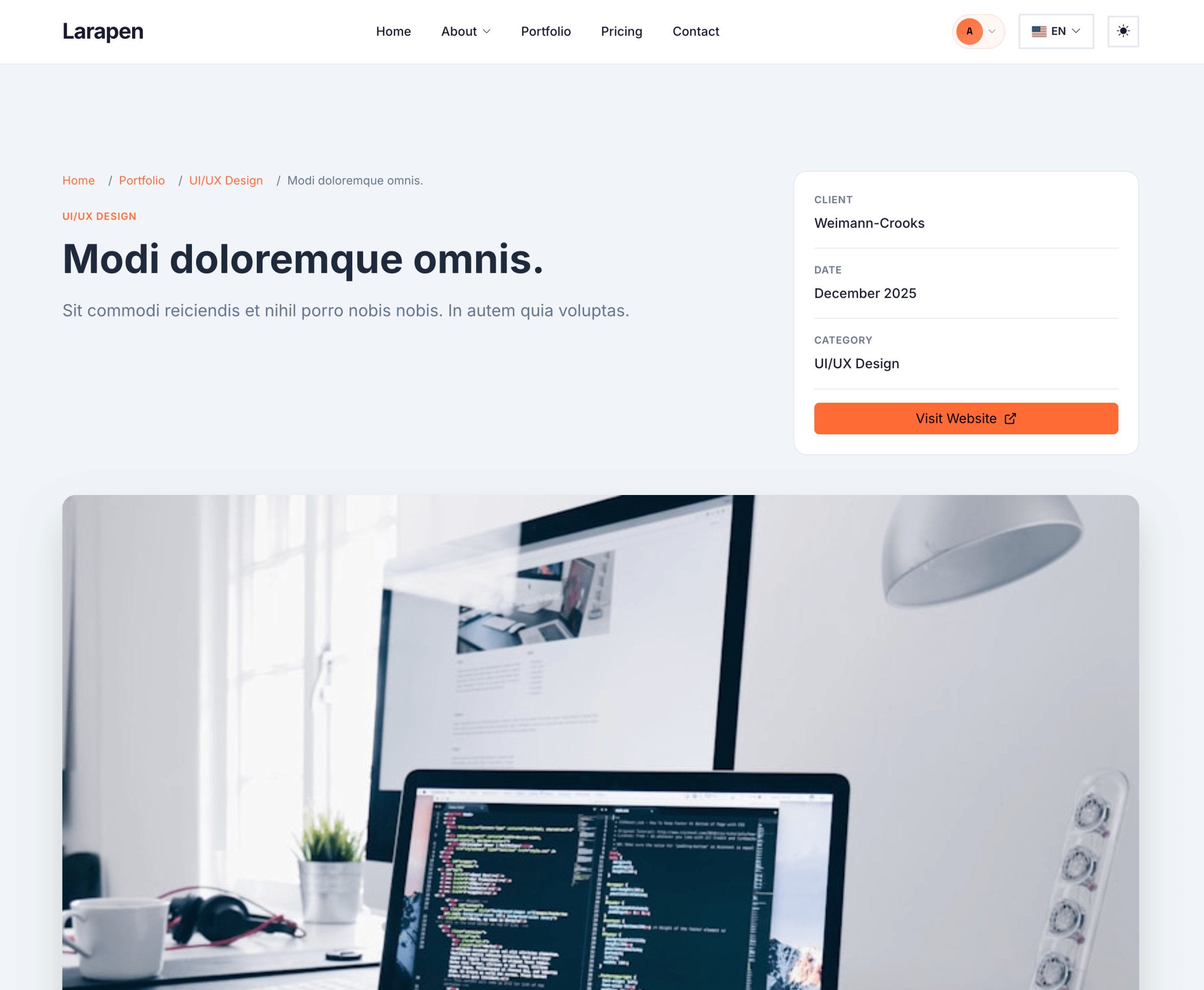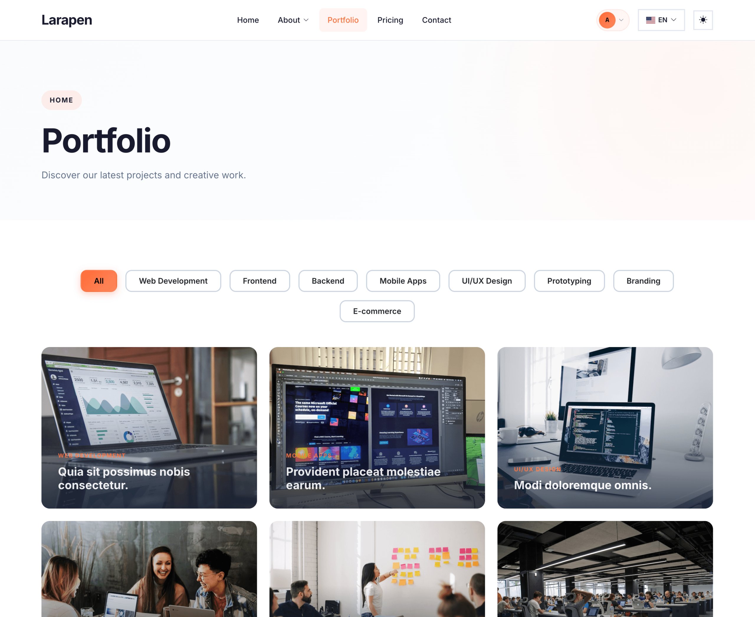 Des vues stylisees pour tous les modules Larapen, y compris Blog, Shop, FAQ, Pricing et plus. Chaque module s'integre nativement dans le langage de design Creative.