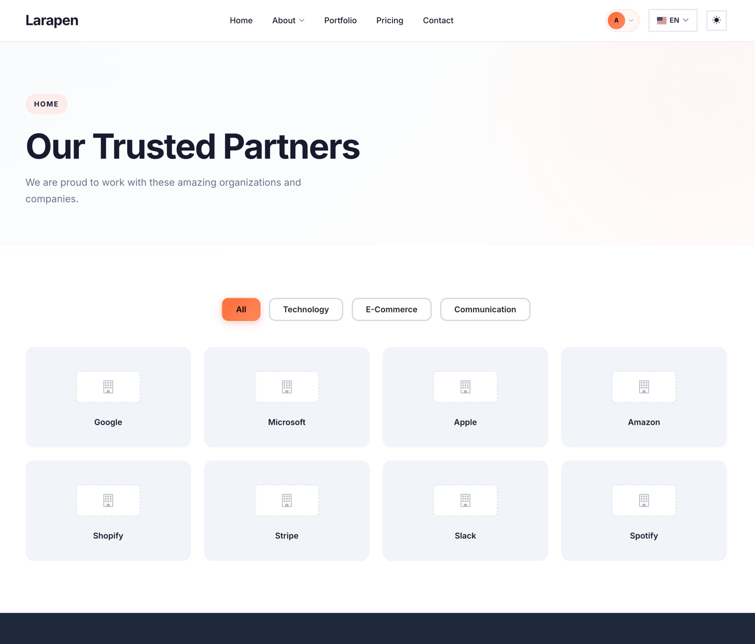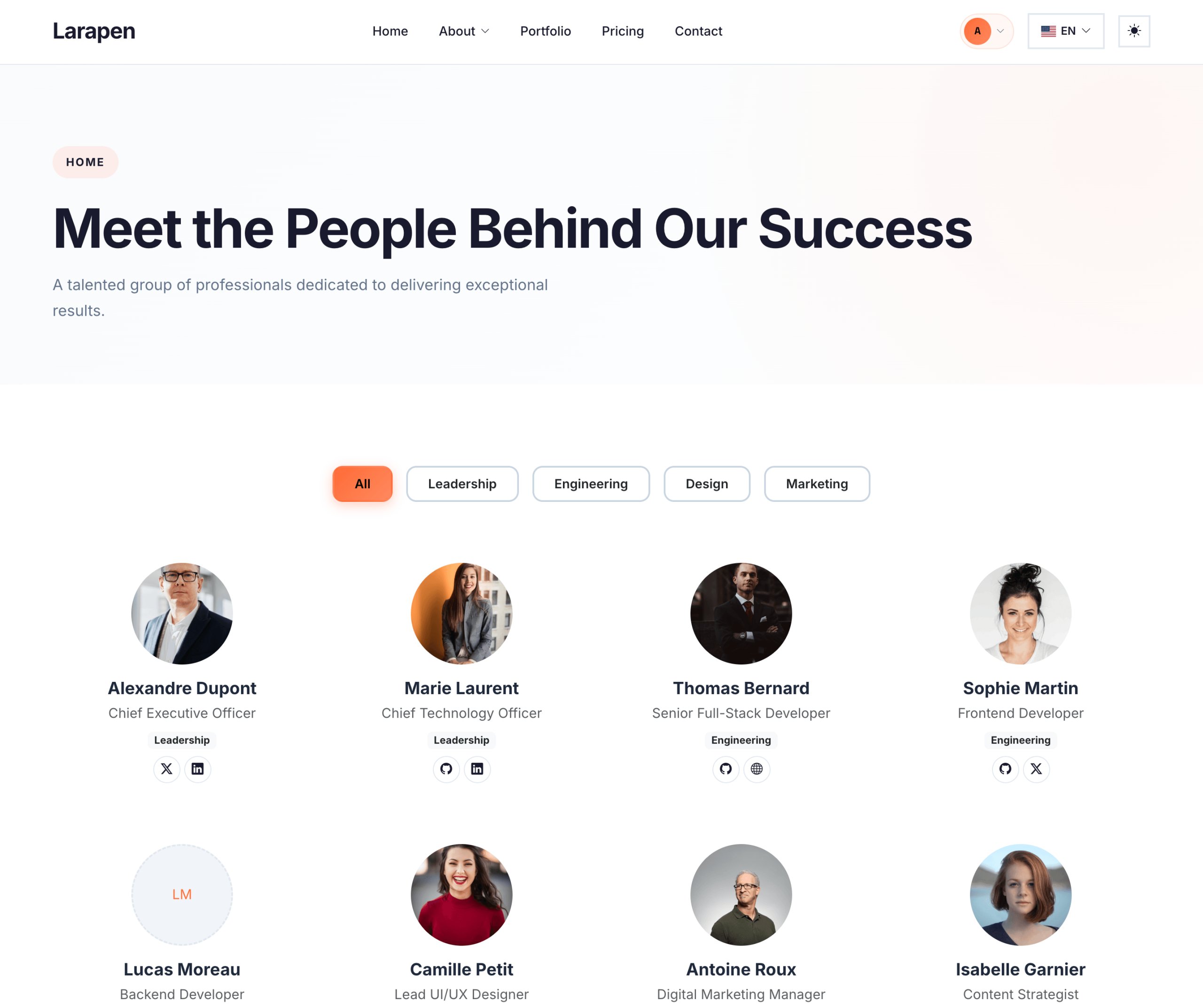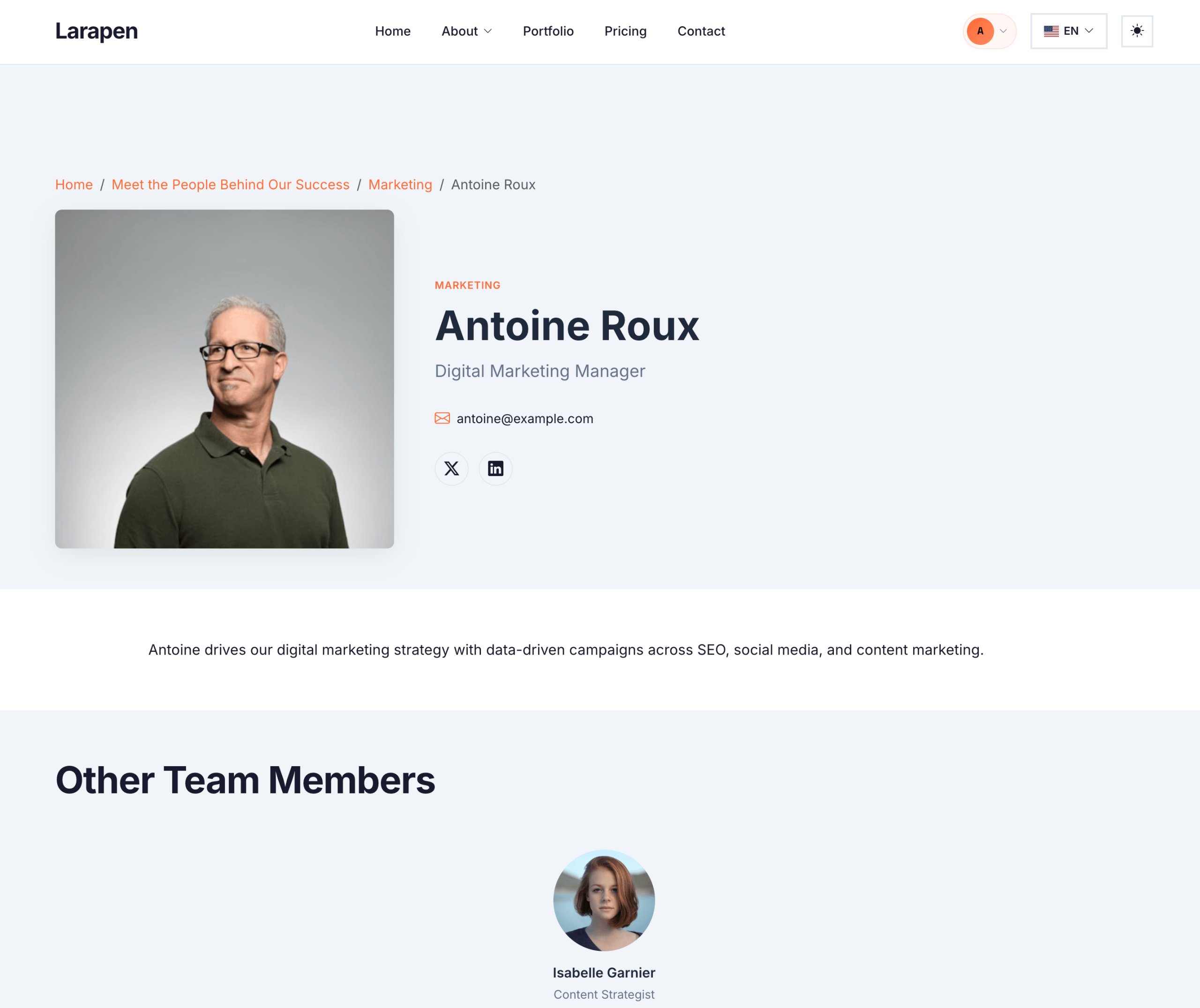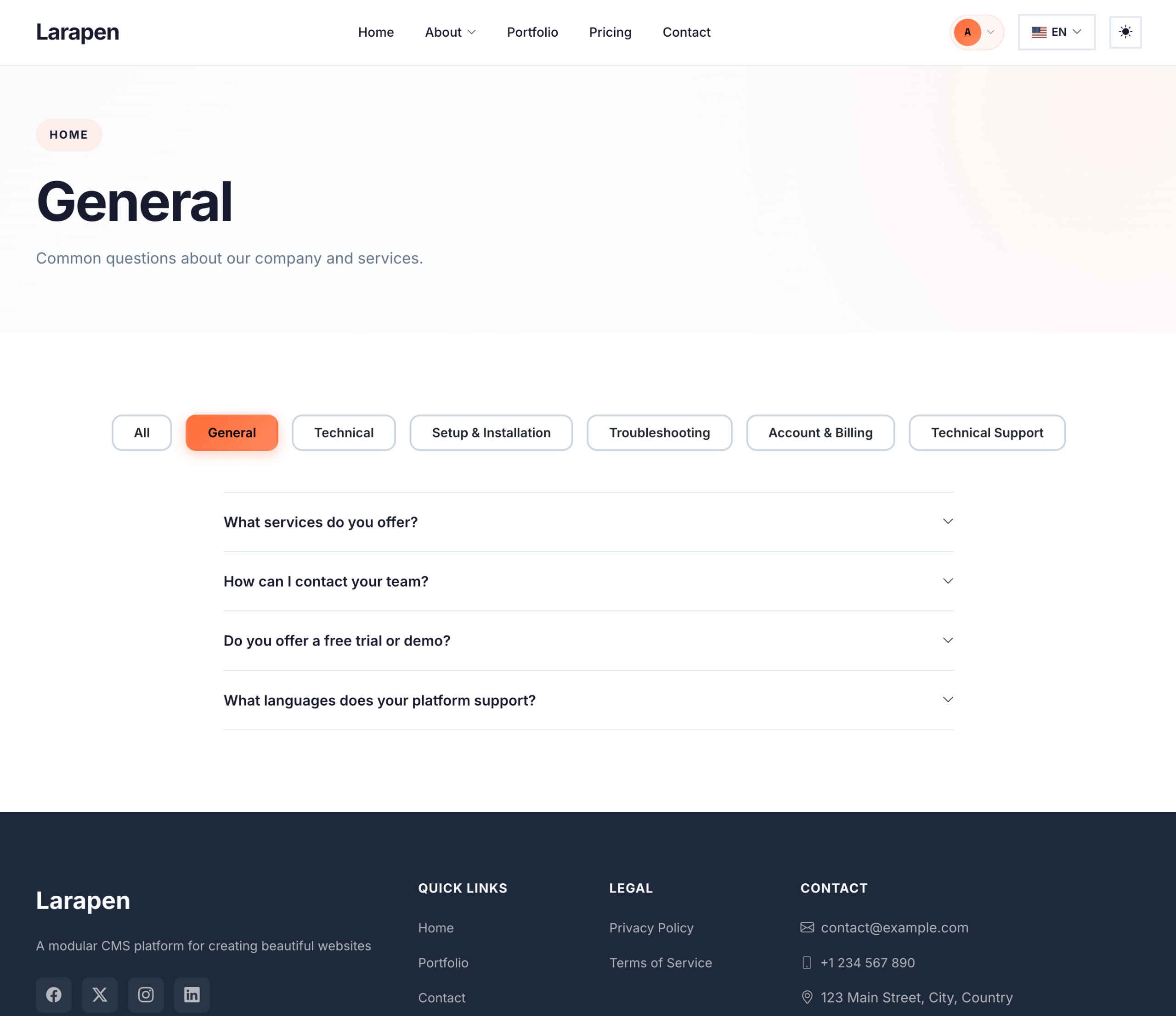 Des vues stylisees pour tous les modules Larapen, y compris Blog, Shop, FAQ, Pricing et plus. Chaque module s'integre nativement dans le langage de design Creative.