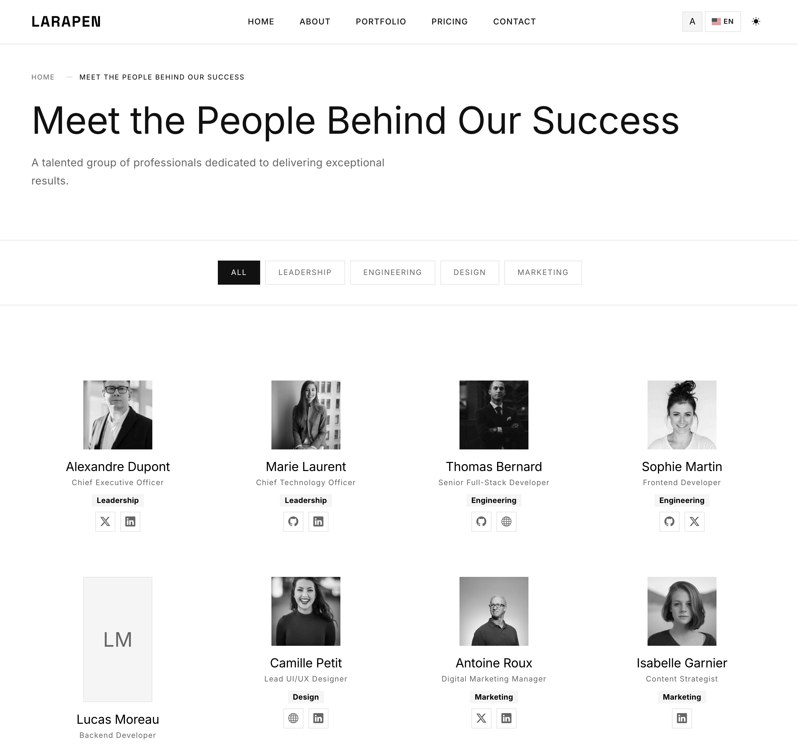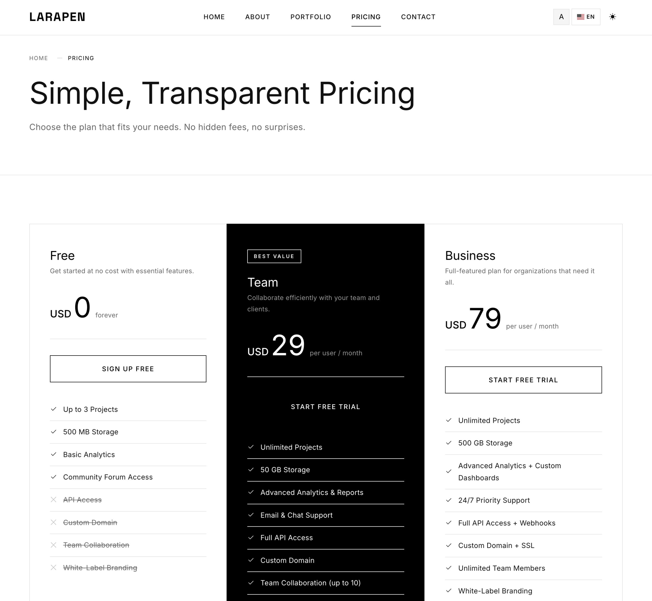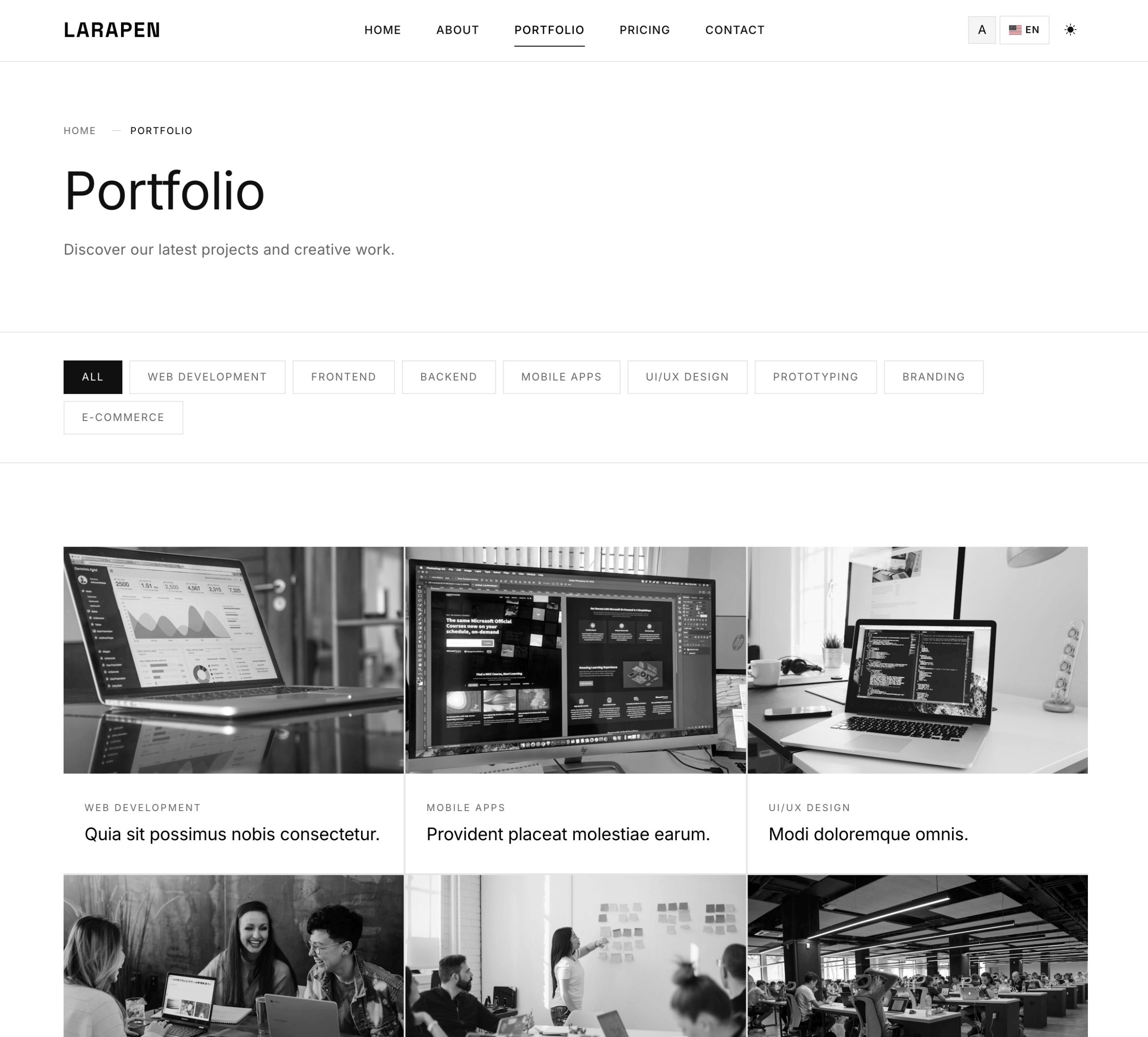 Chaque module Larapen: Blog, Shop, FAQ, Pricing, Team, Portfolio; dispose de vues stylisees qui suivent la philosophie du design Minimalist. Epure, coherent, axe sur le contenu.