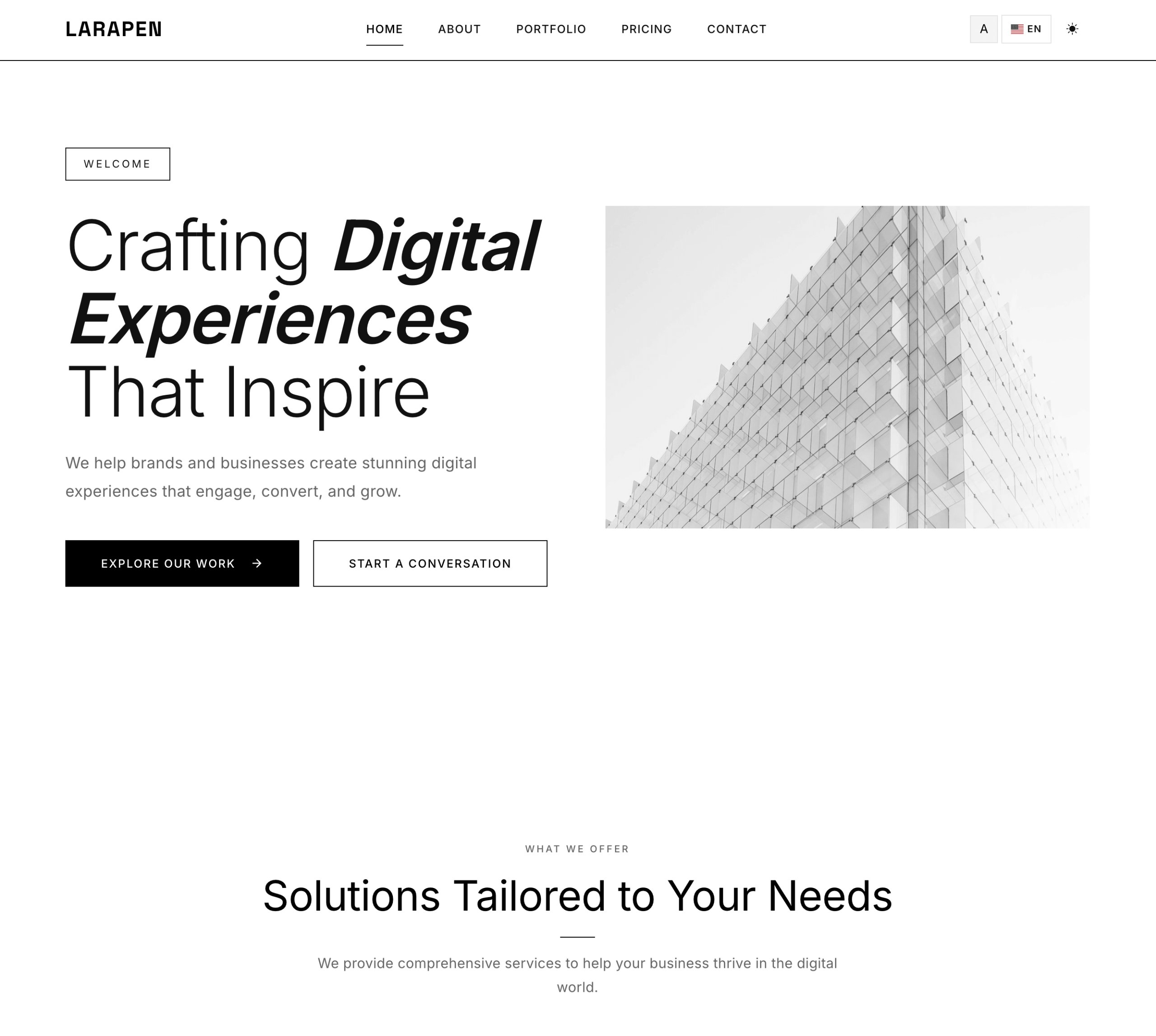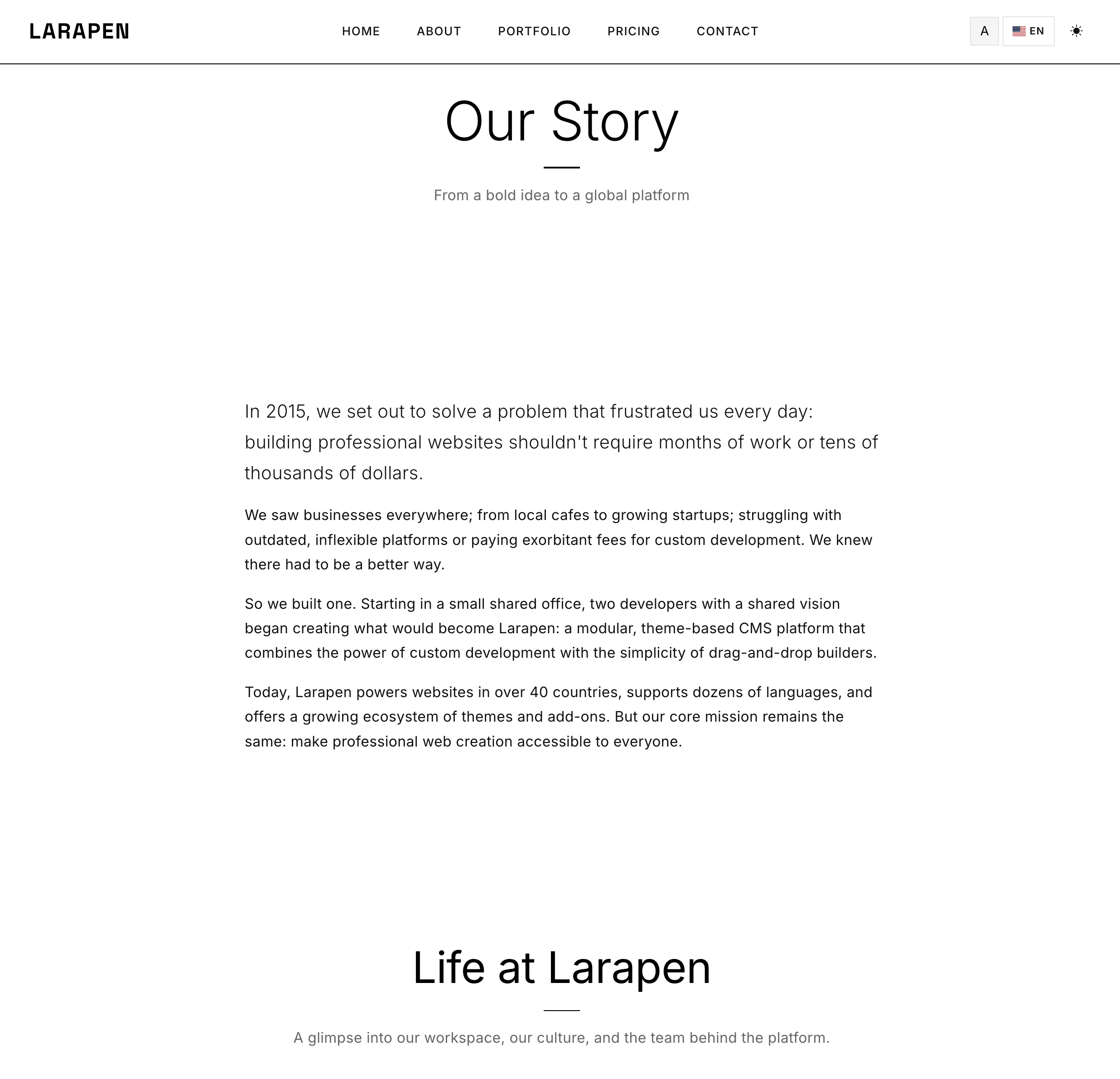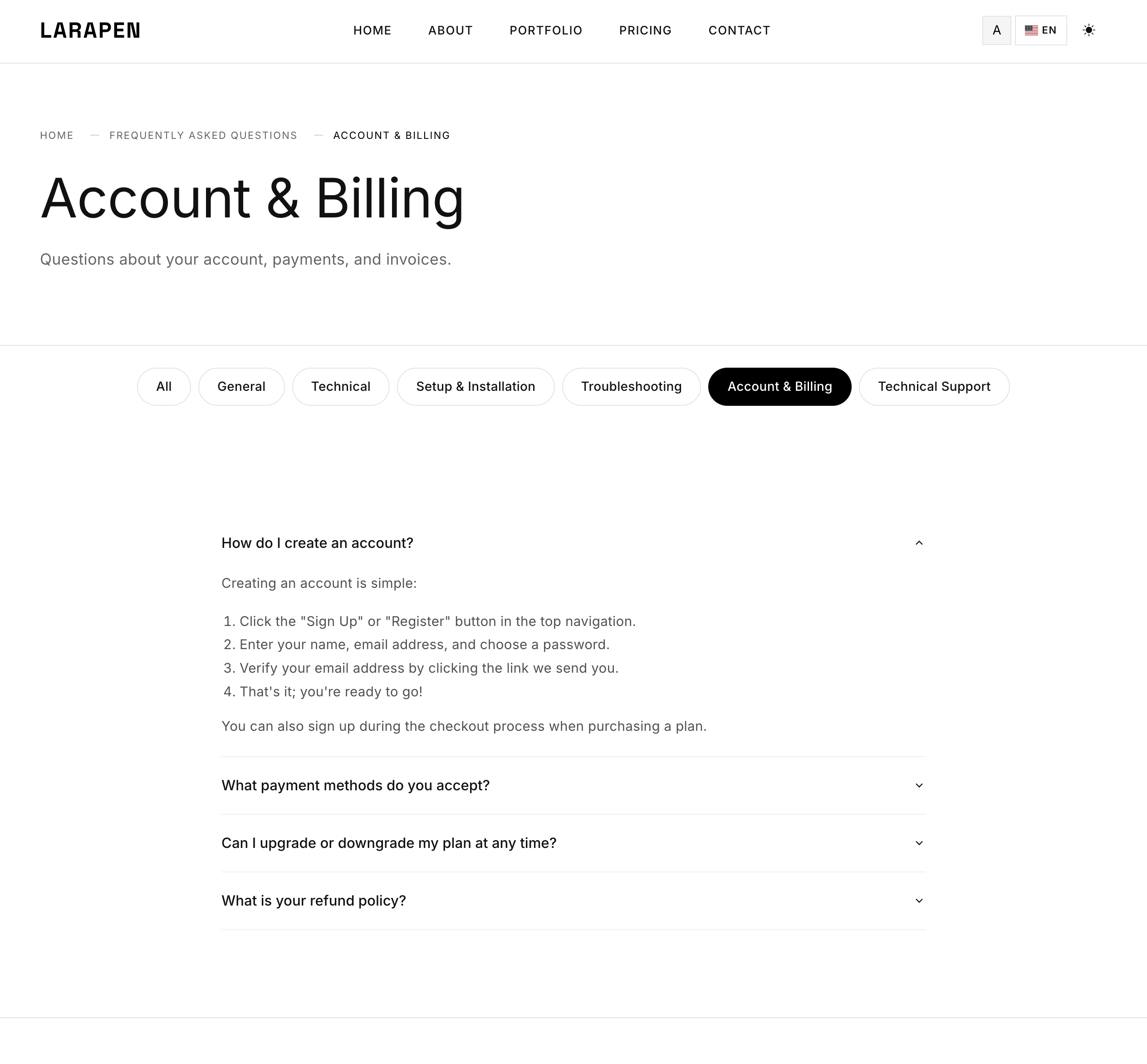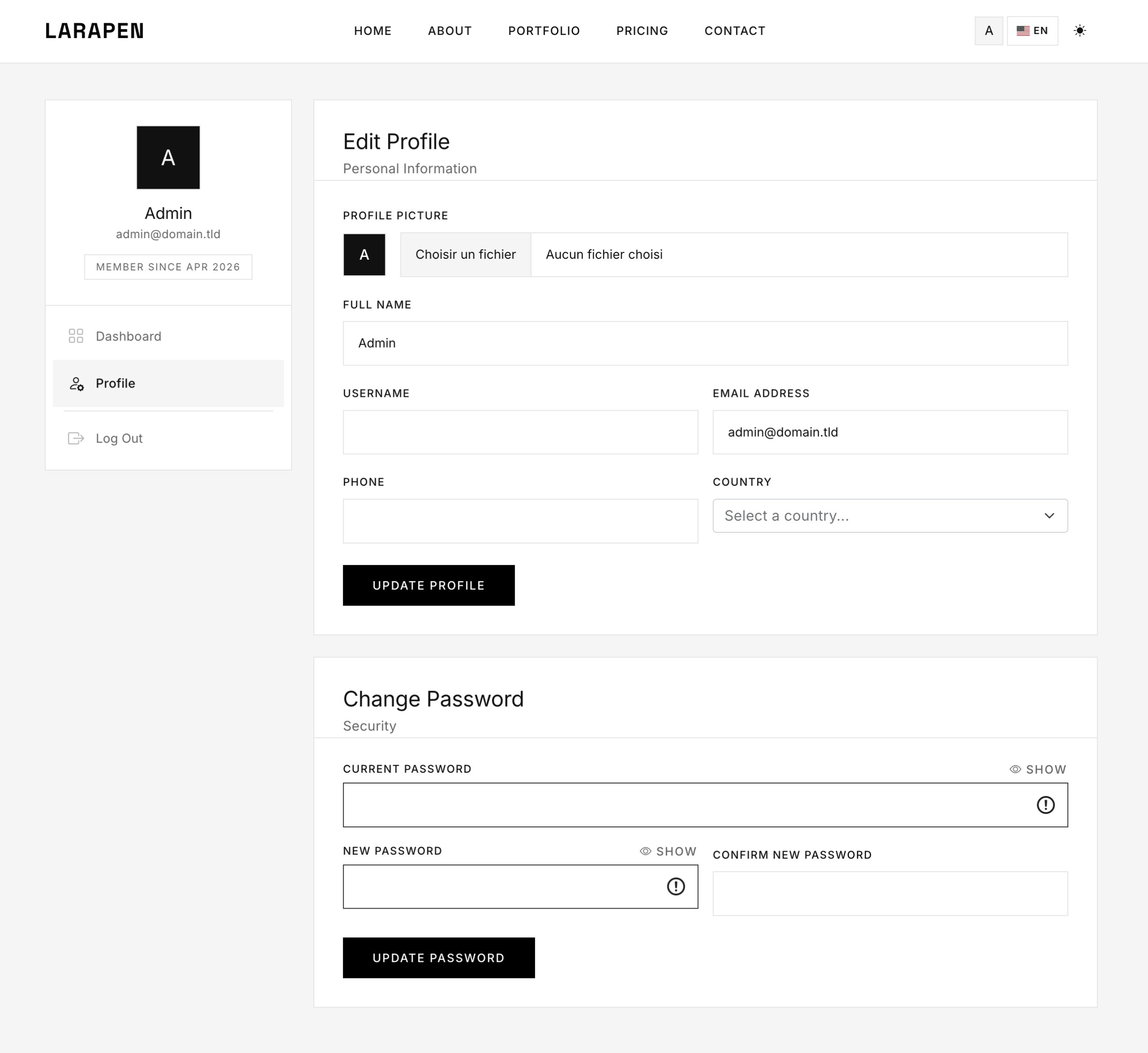 Chaque module Larapen: Blog, Shop, FAQ, Pricing, Team, Portfolio; dispose de vues stylisees qui suivent la philosophie du design Minimalist. Epure, coherent, axe sur le contenu.