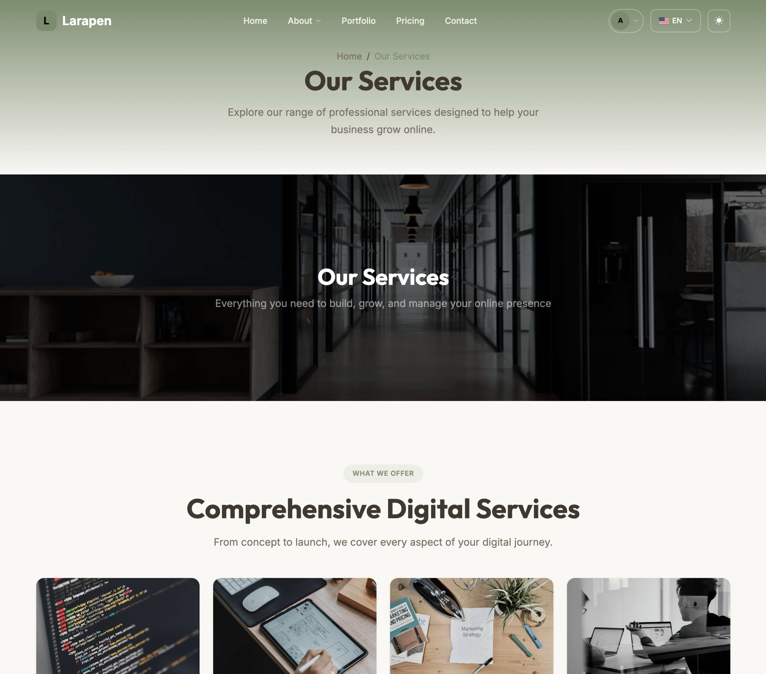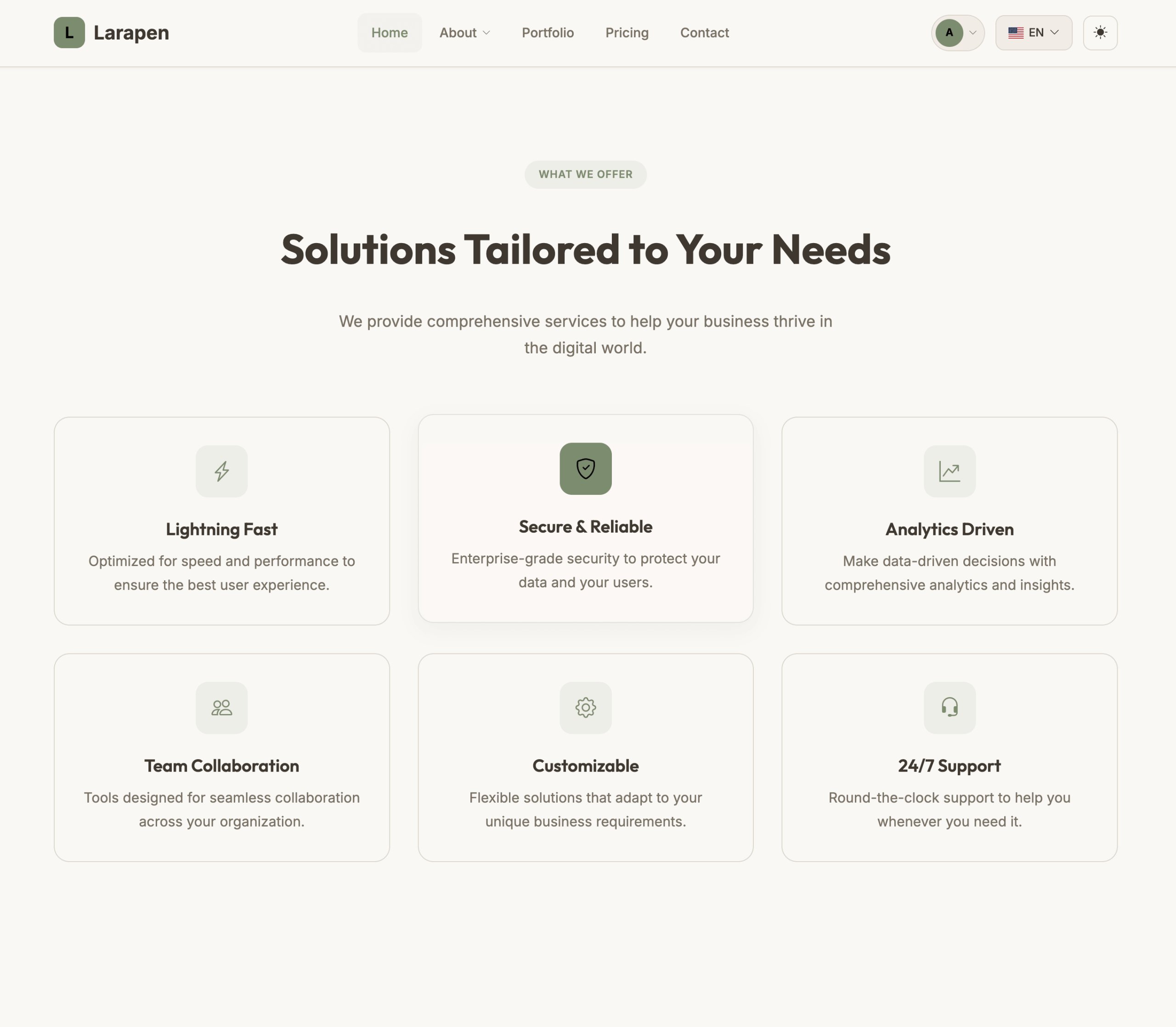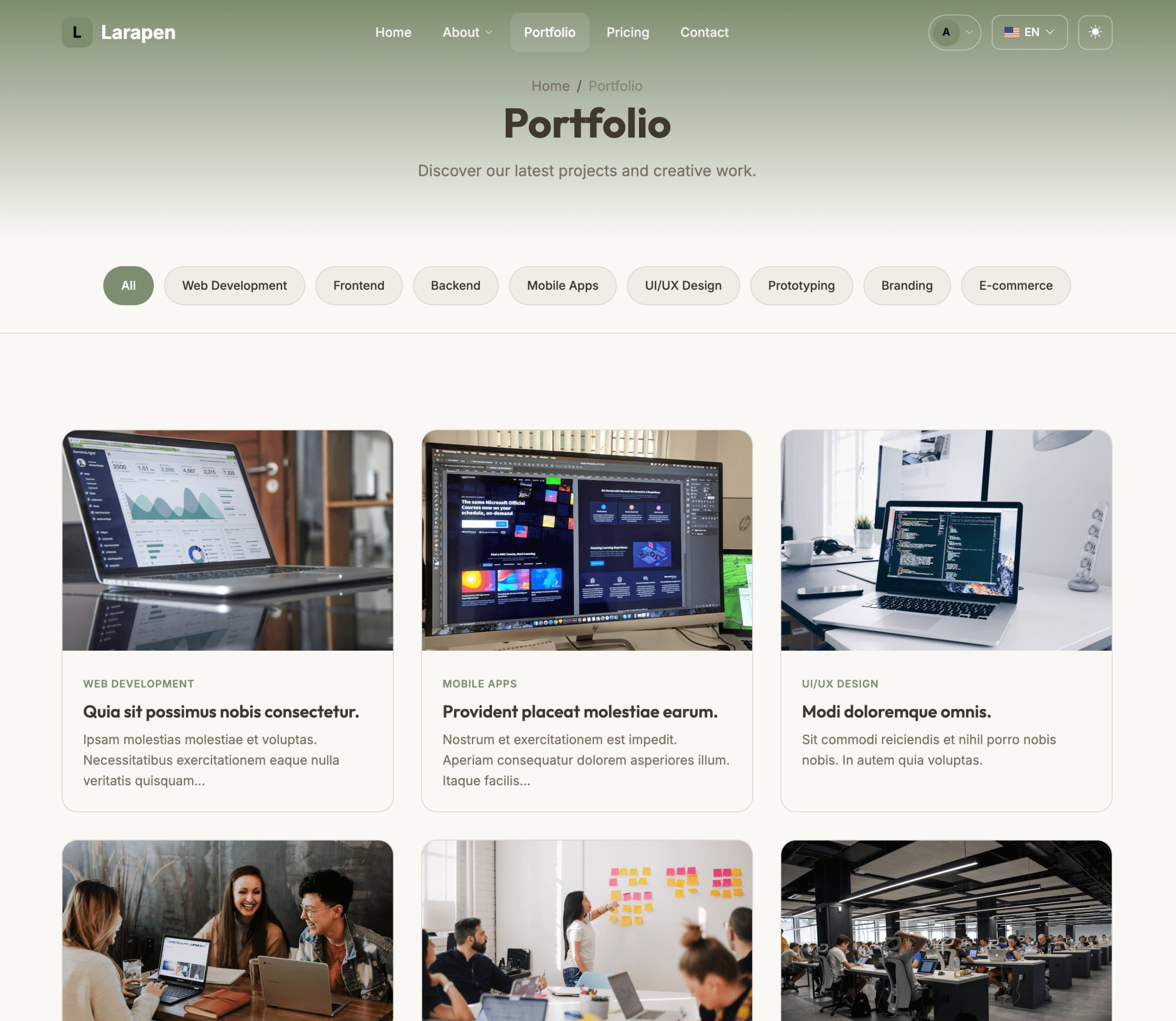 Des vues stylisees pour chaque module Larapen. Les produits de la boutique s'affichent dans des cartes chaudes et arrondies. Les articles de blog utilisent une mise en page de lecture chaleureuse. Tous les modules s'integrent nativement dans le langage de design Olive.