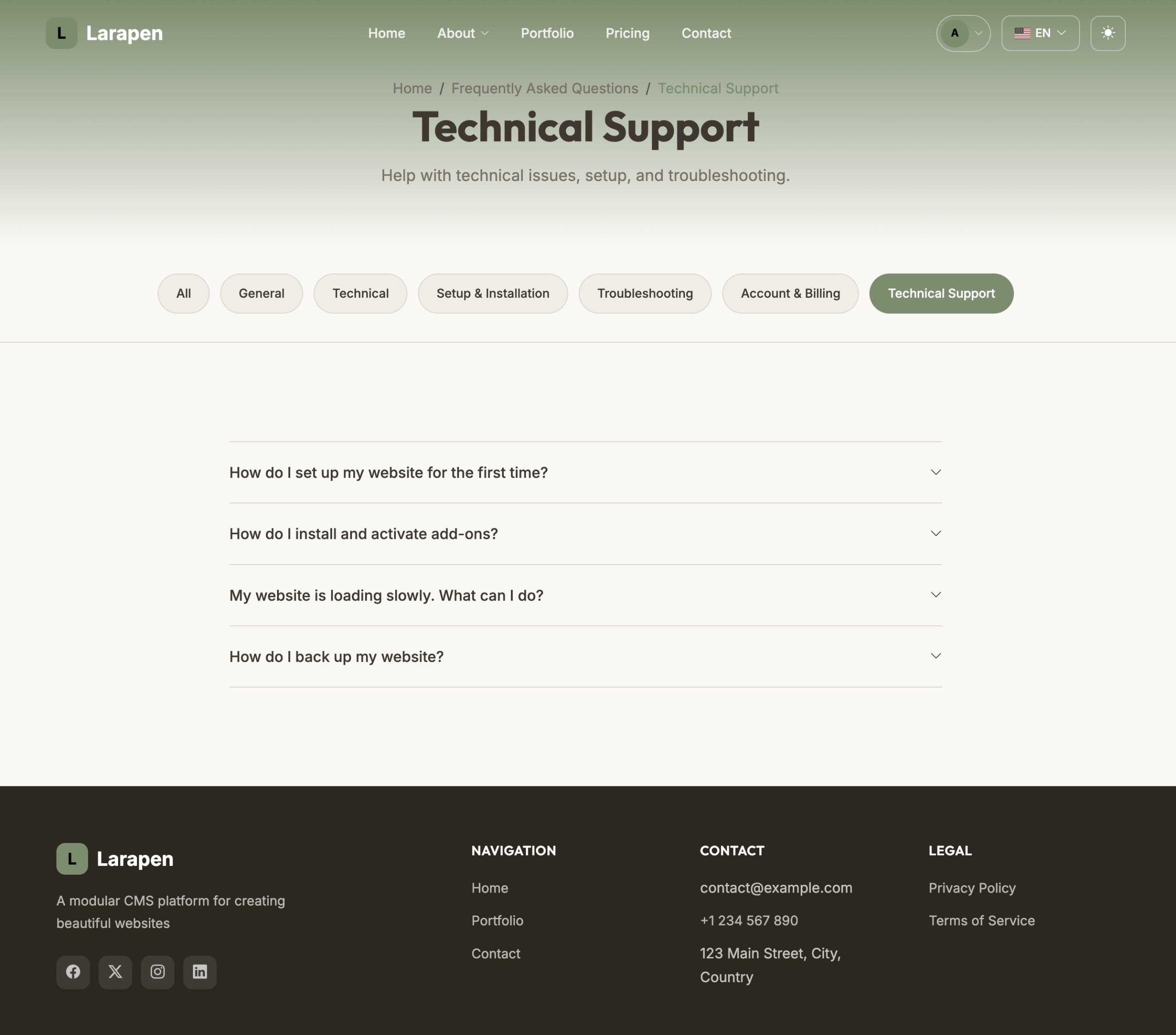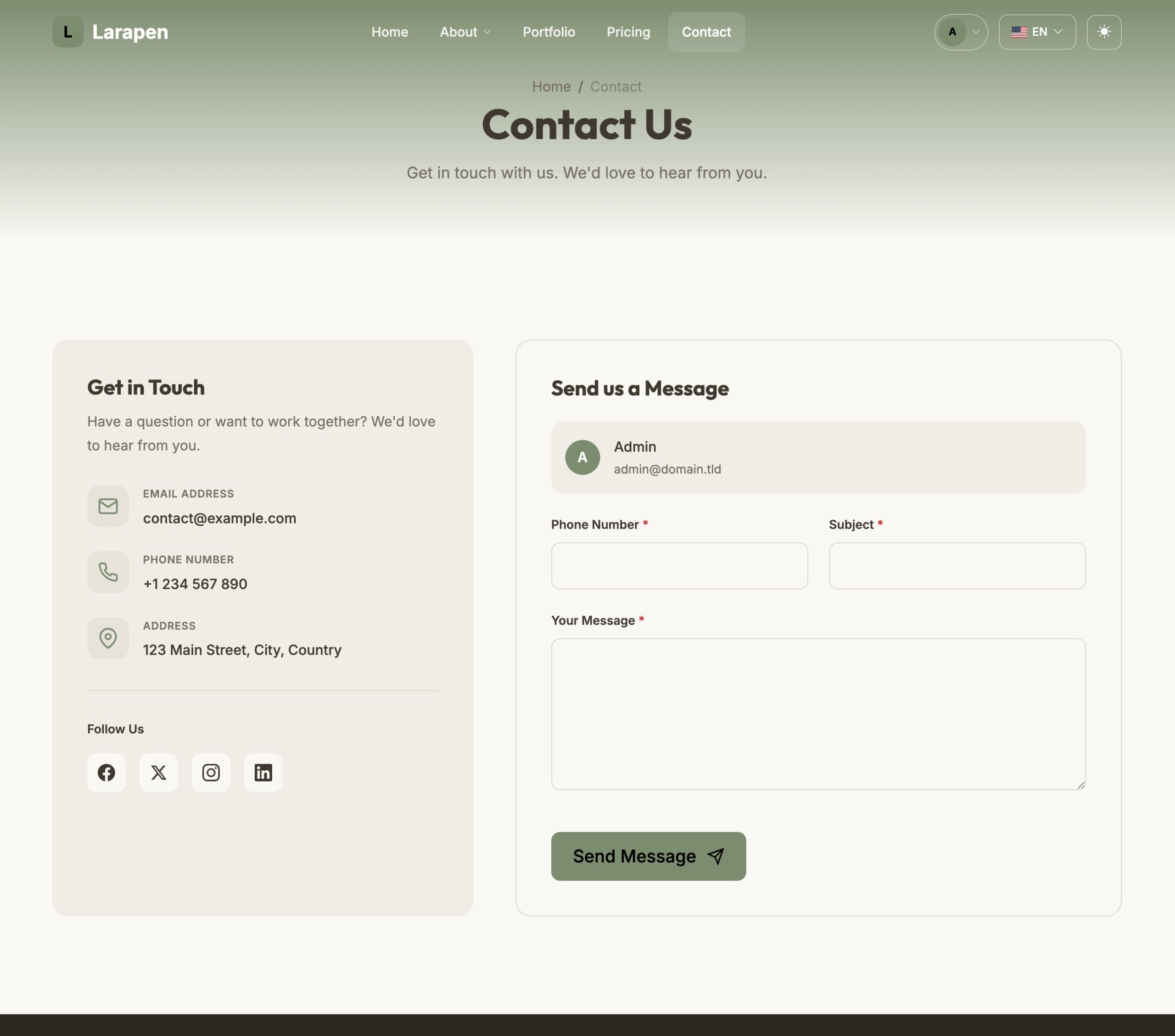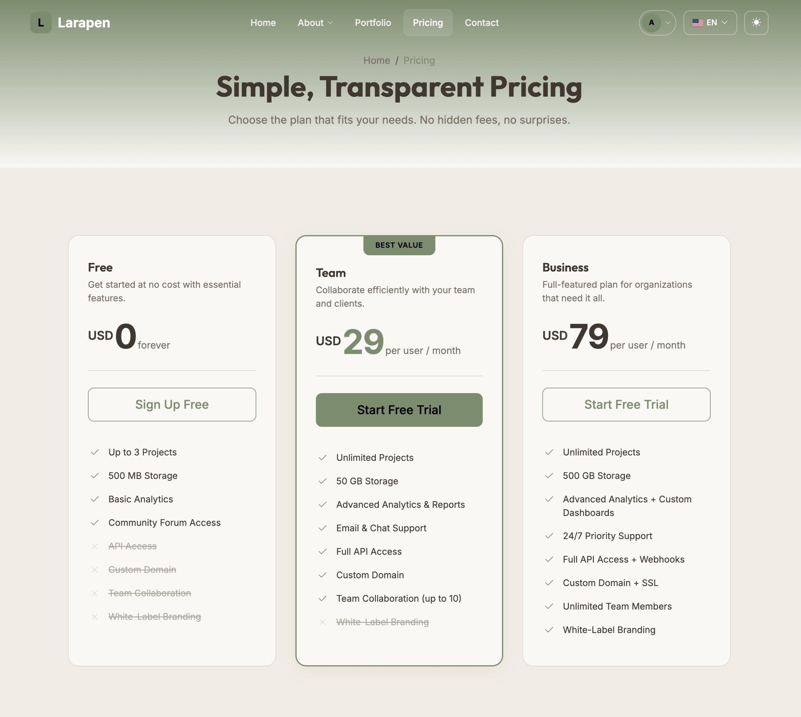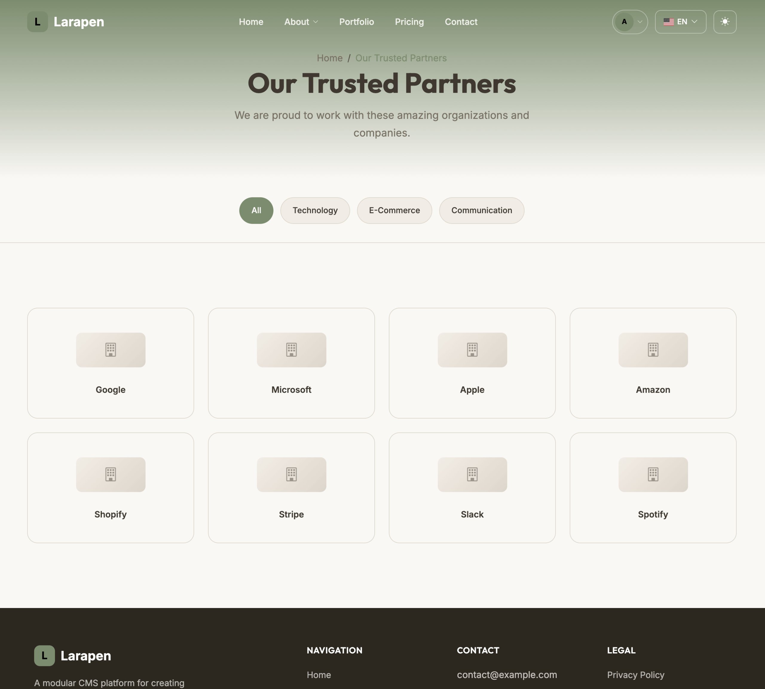 Des vues stylisees pour chaque module Larapen. Les produits de la boutique s'affichent dans des cartes chaudes et arrondies. Les articles de blog utilisent une mise en page de lecture chaleureuse. Tous les modules s'integrent nativement dans le langage de design Olive.