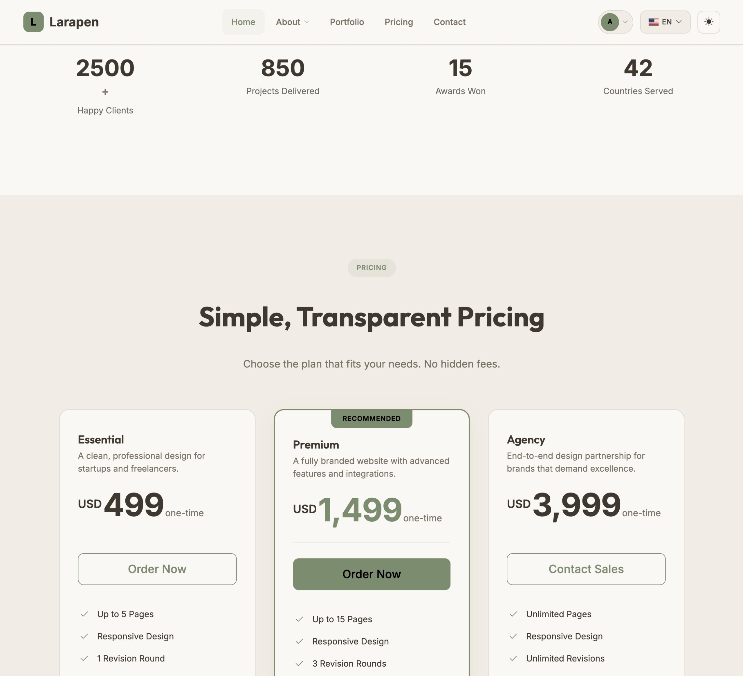 Le theme Olive associe une serif chaleureuse et humaniste pour les titres avec une sans-serif arrondie et epuree pour le corps du texte; creant un ton accueillant qui semble personnel plutot que corporatif. Les elements de design presentent des coins arrondis doux, des formes de separateurs organiques et des accents decoratifs inspires des feuilles qui renforcent le theme naturel sans paraitre kitsch. Chaque detail est concu pour que les visiteurs se sentent bienvenus et a l'aise.