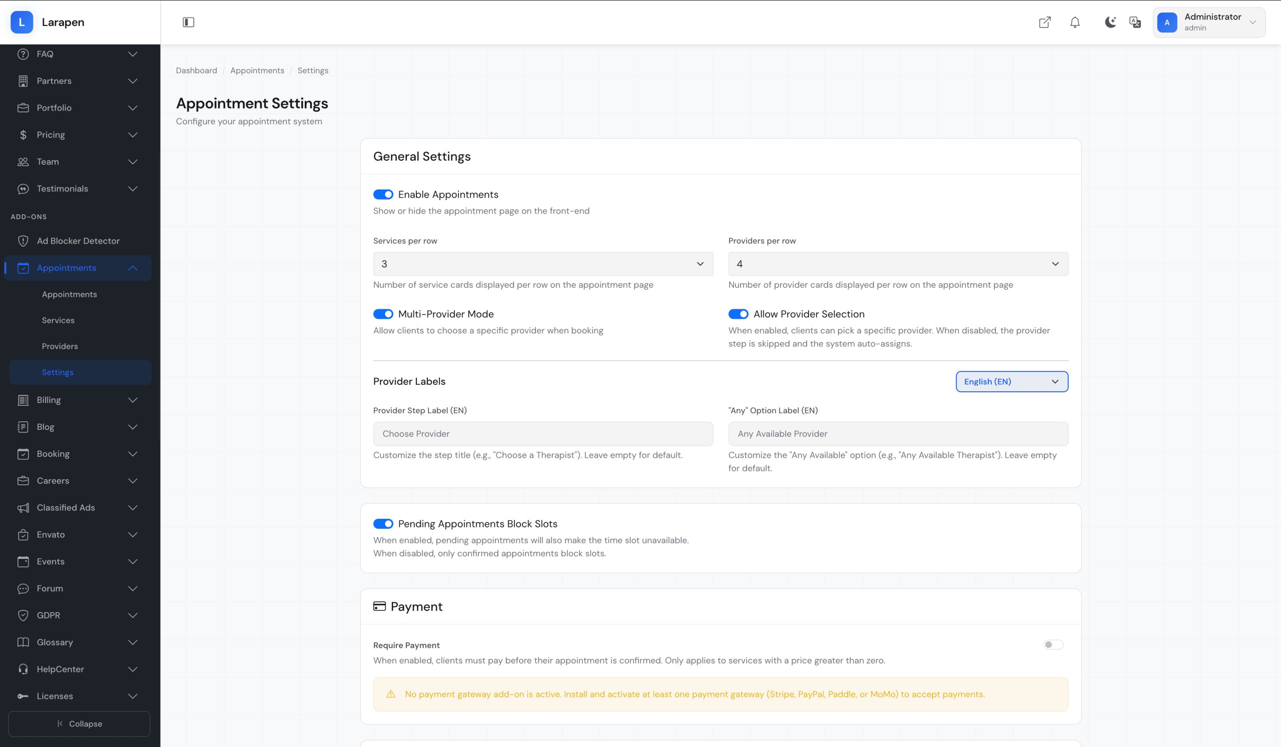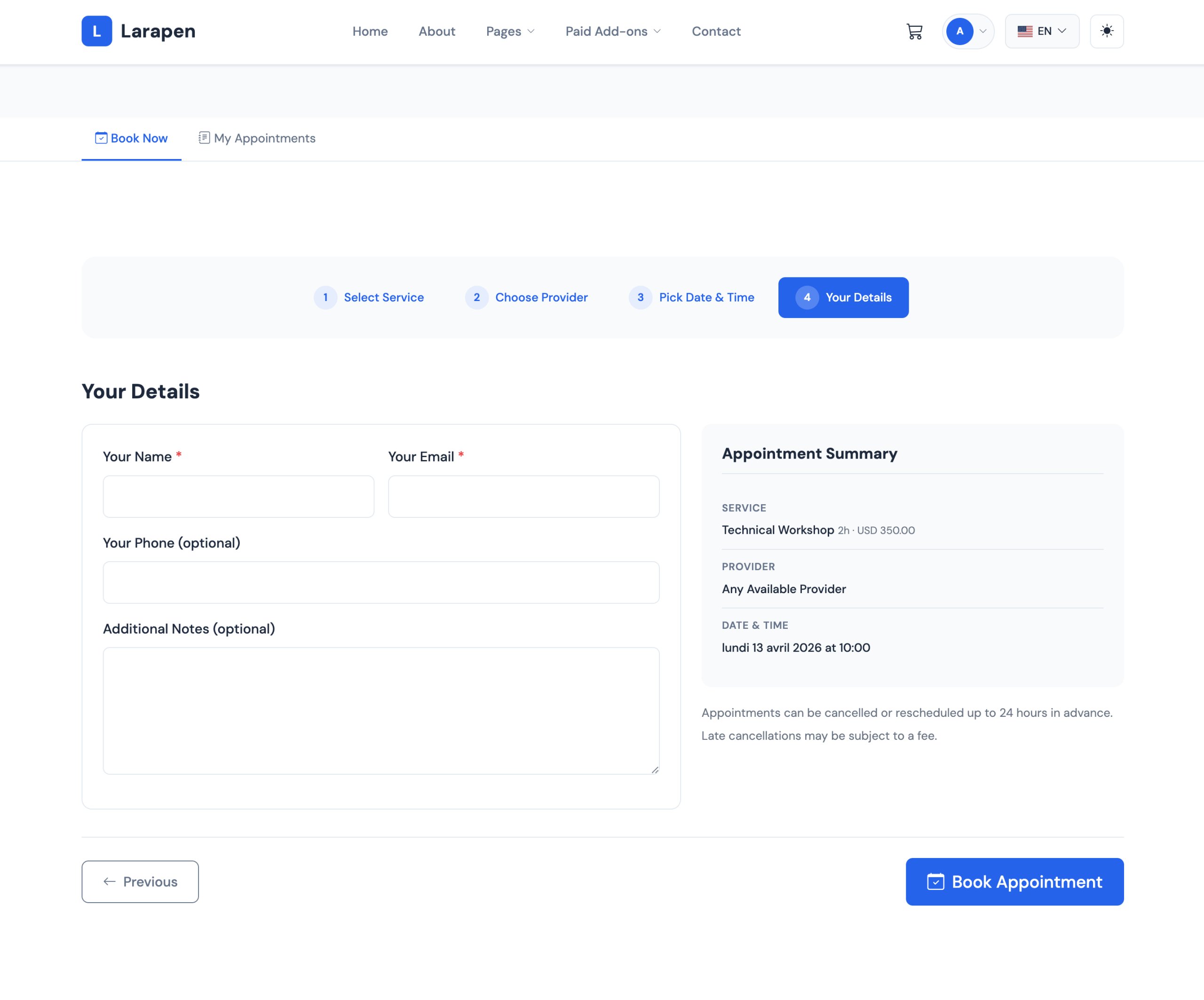 Let clients book appointments and services directly on your website. Manage availability, time slots, confirmations, and reminders. All from your Larapen admin panel.