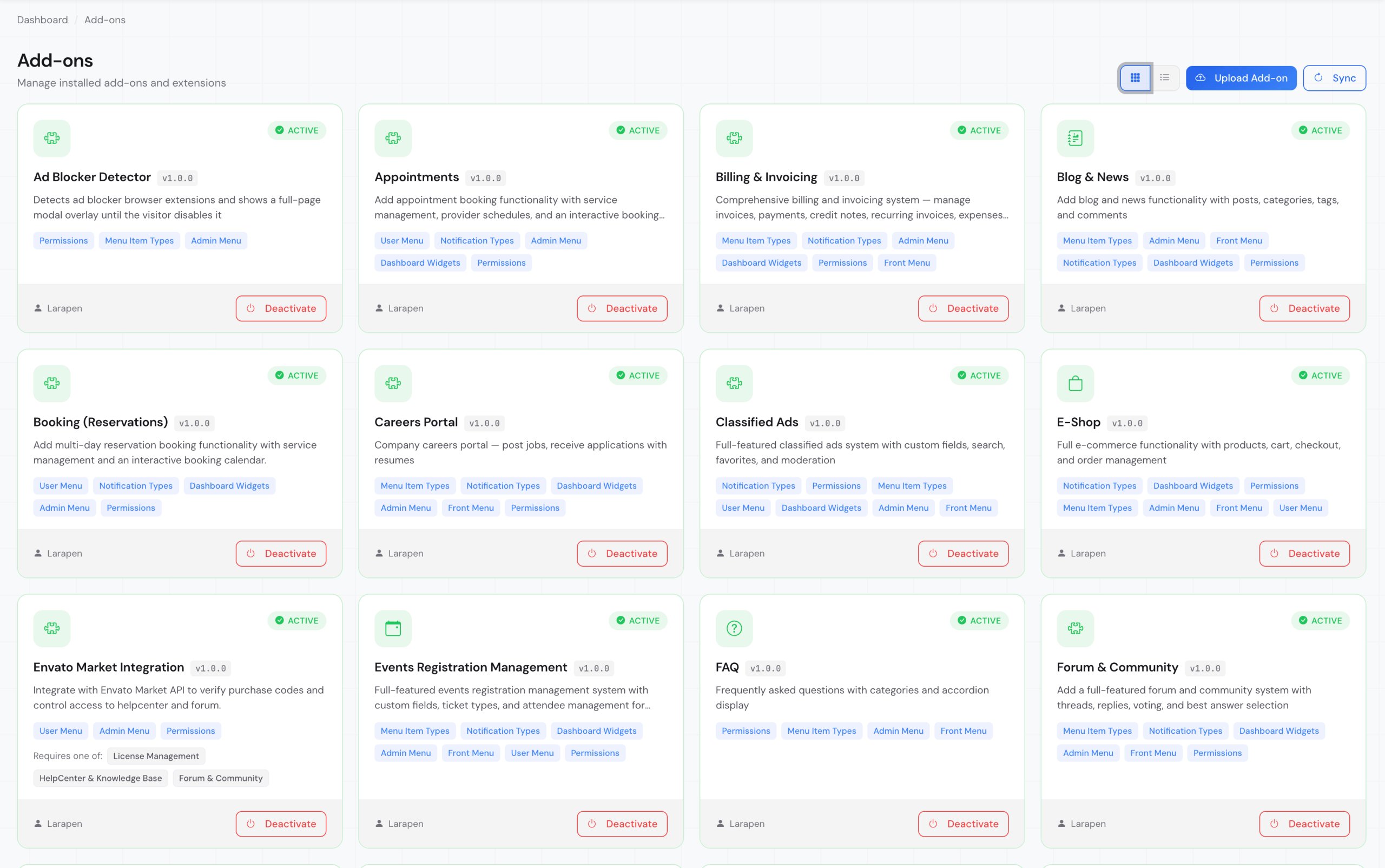 L'architecture modulaire de Larapen vous permet d'ajouter exactement les fonctionnalités dont votre site a besoin. Choisissez parmi des outils de contenu comme Blog, Newsletter, Forum et Centre d'aide ; des modules business incluant Boutique, Réservation, Facturation, Événements, Carrières et POS ; des passerelles de paiement comme Stripe, PayPal, Paddle et MTN MoMo ; ainsi que des outils de conformité et de plateforme comme RGPD, Webmail et intégration Envato. Chaque module est vendu séparément, s'intègre parfaitement avec tous les thèmes et peut être installé ou supprimé à tout moment sans affecter votre plateforme principale.