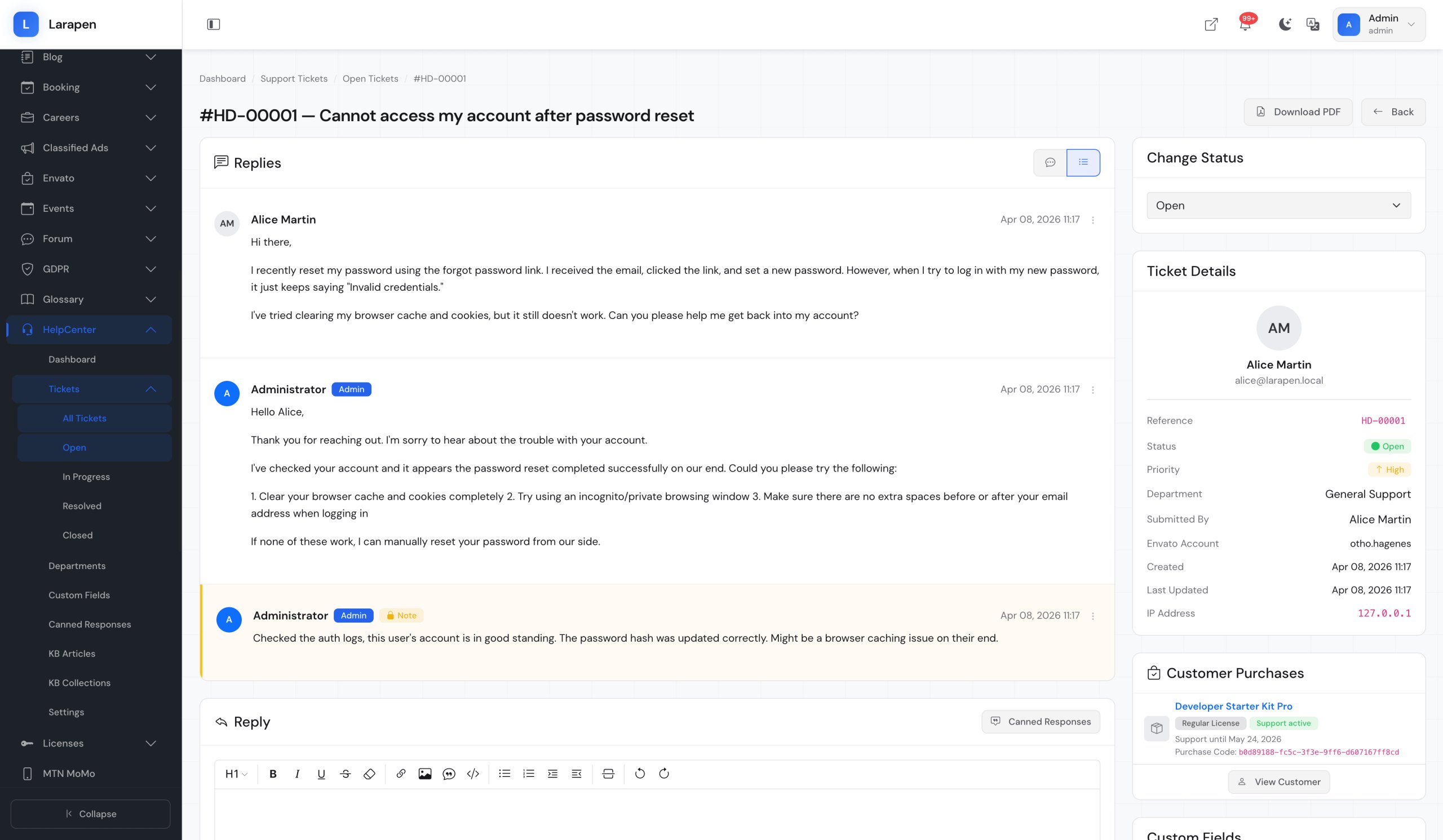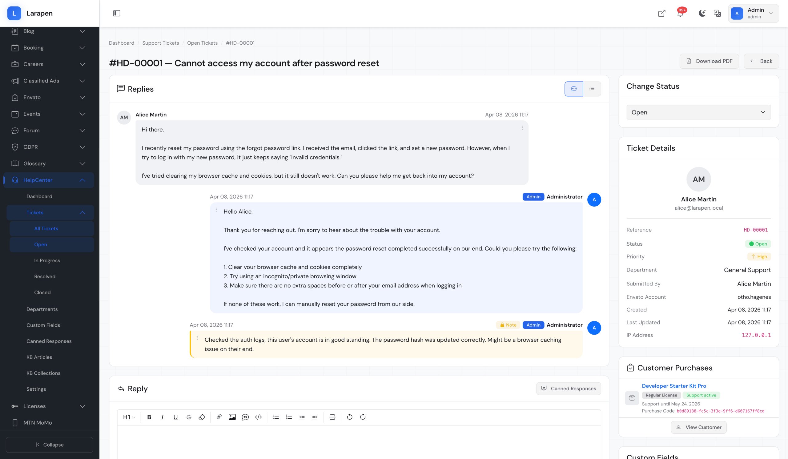 Lorsque le libre-service ne suffit pas, les utilisateurs peuvent soumettre des tickets de support directement depuis le centre d'aide, routés vers le bon département.