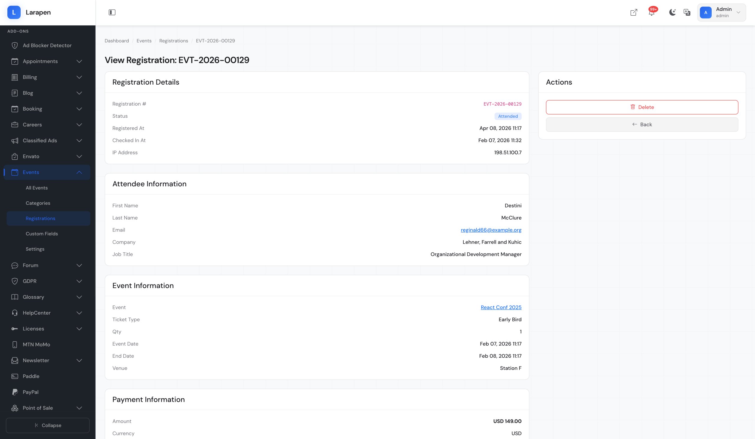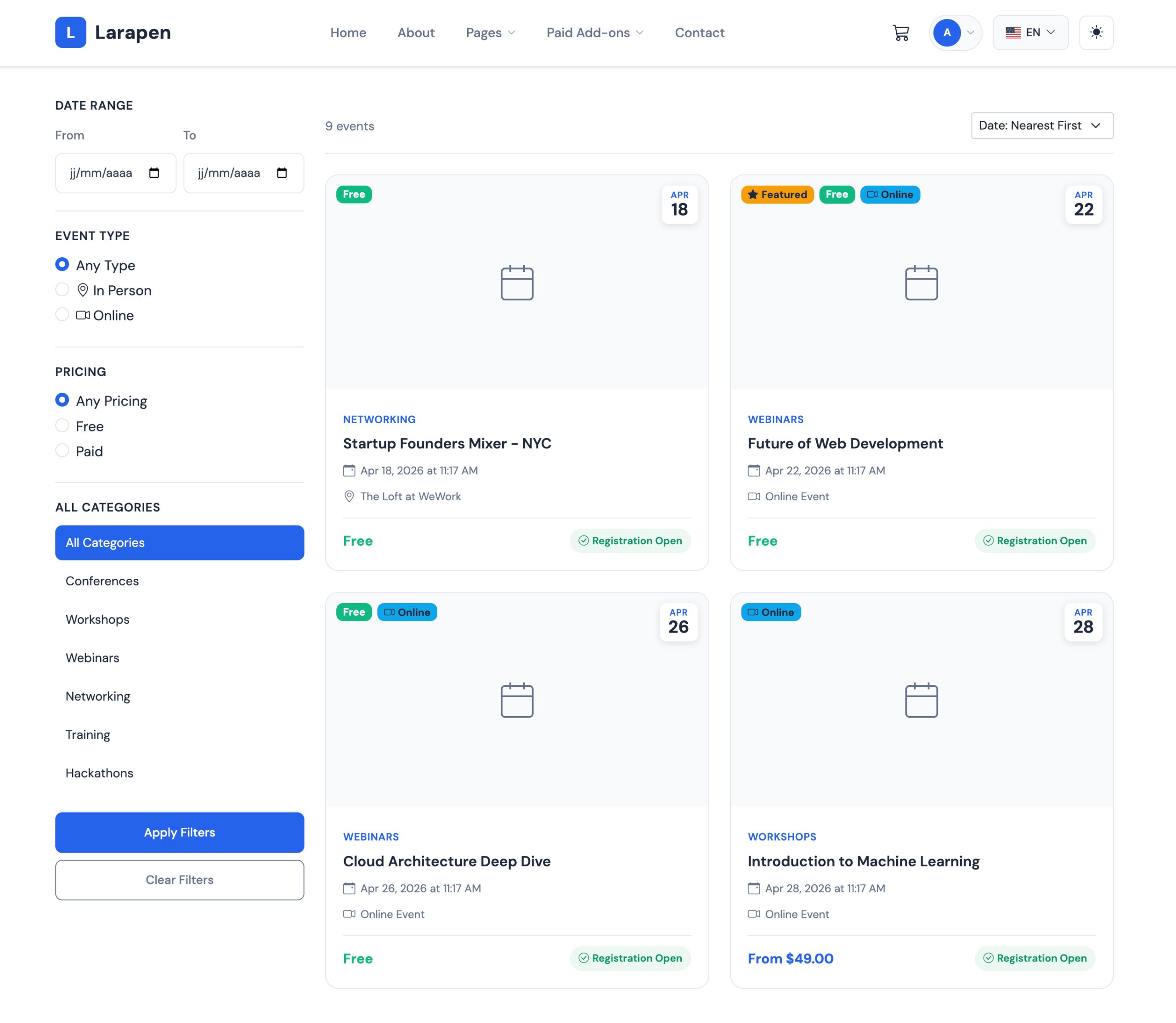 Arrêtez de dépendre de plateformes d'événements tierces qui diluent votre marque. Le module Événements vous permet de publier des listings d'événements directement sur votre site Larapen, avec des descriptions riches, images à la une, détails du lieu et cartes interactives. Les visiteurs s'inscrivent et achètent des billets sans quitter votre site.