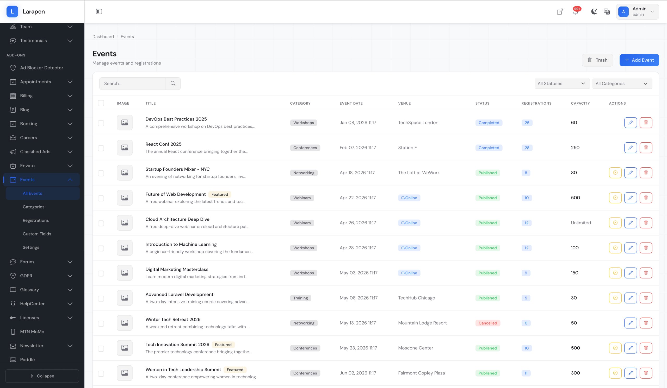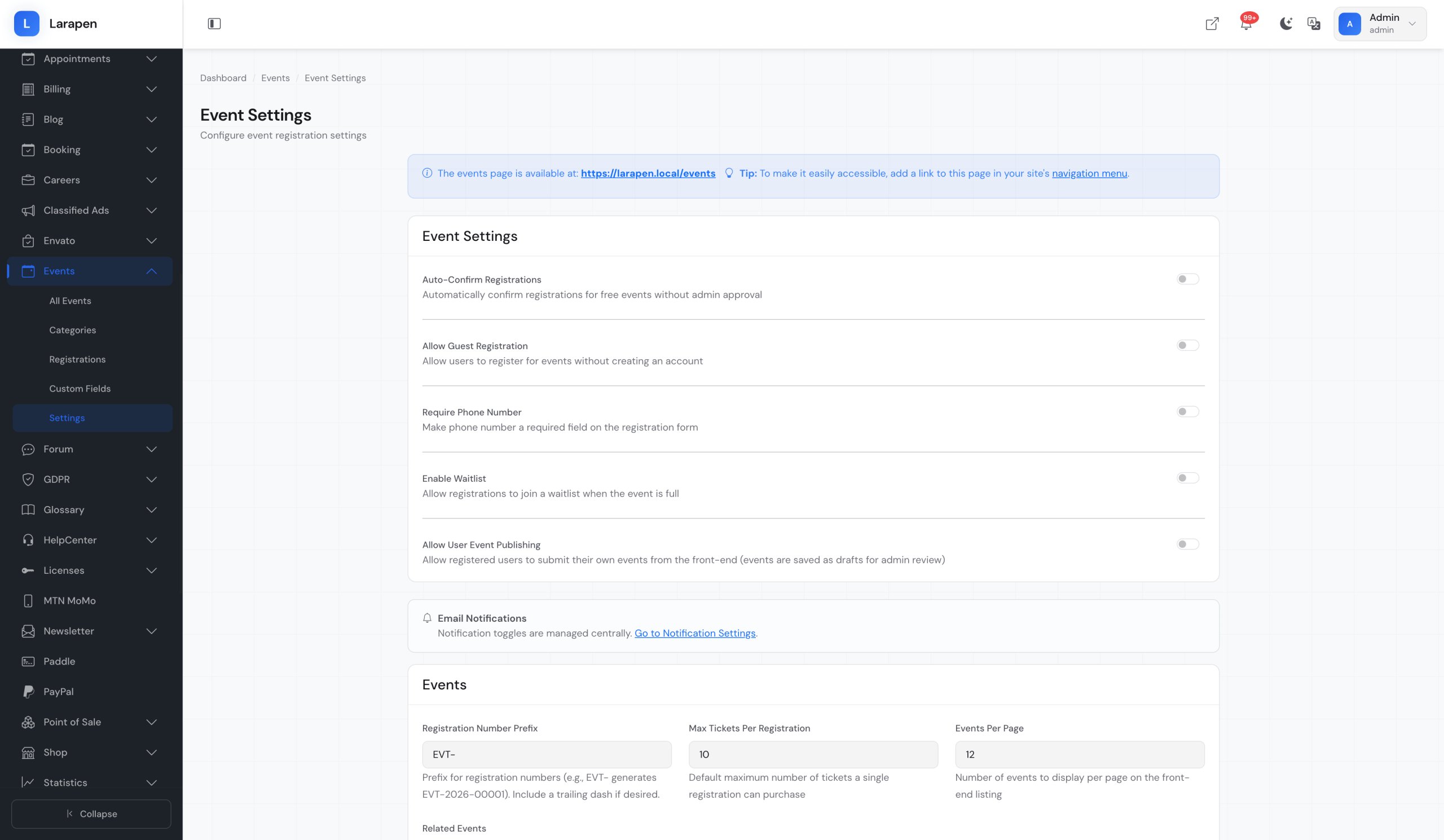 Gérez des événements, conférences et rencontres directement depuis votre site. Créez des événements avec inscription, gestion des billets, vues calendrier et suivi des participants; le tout intégré à votre plateforme Larapen.