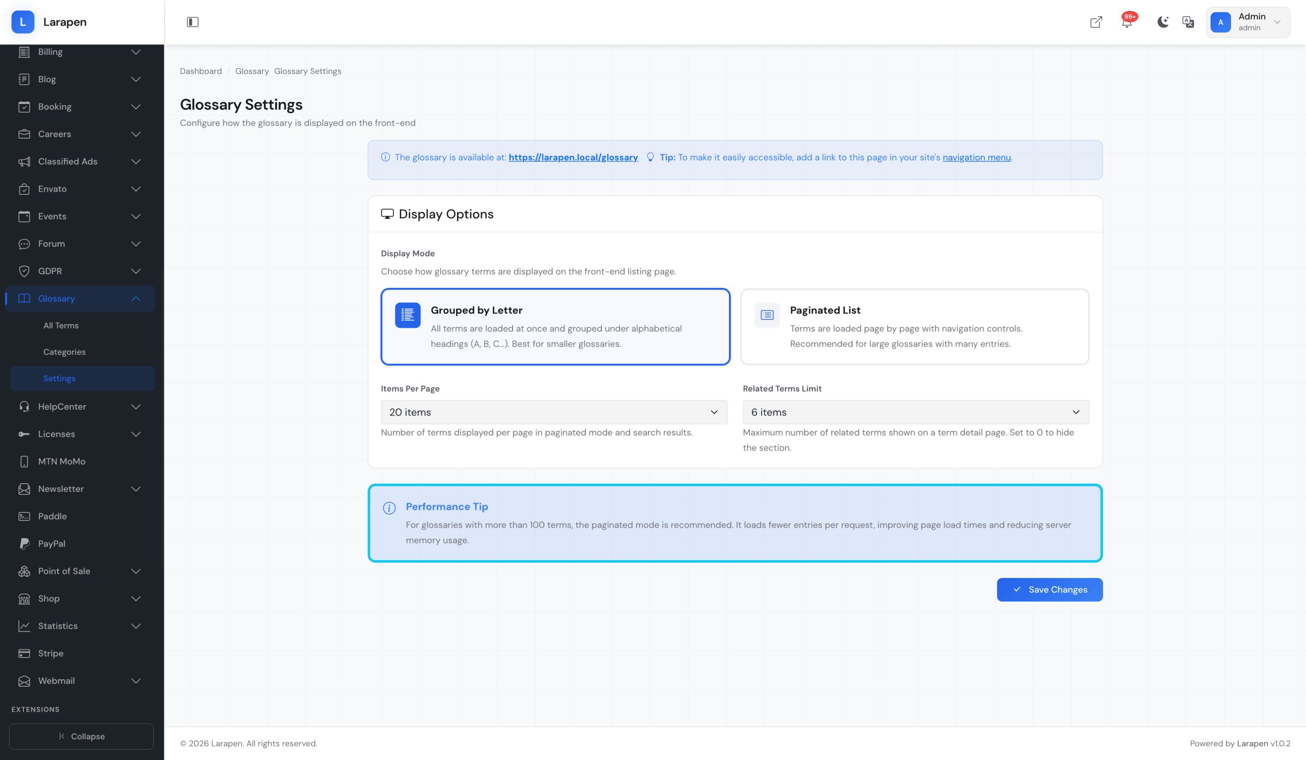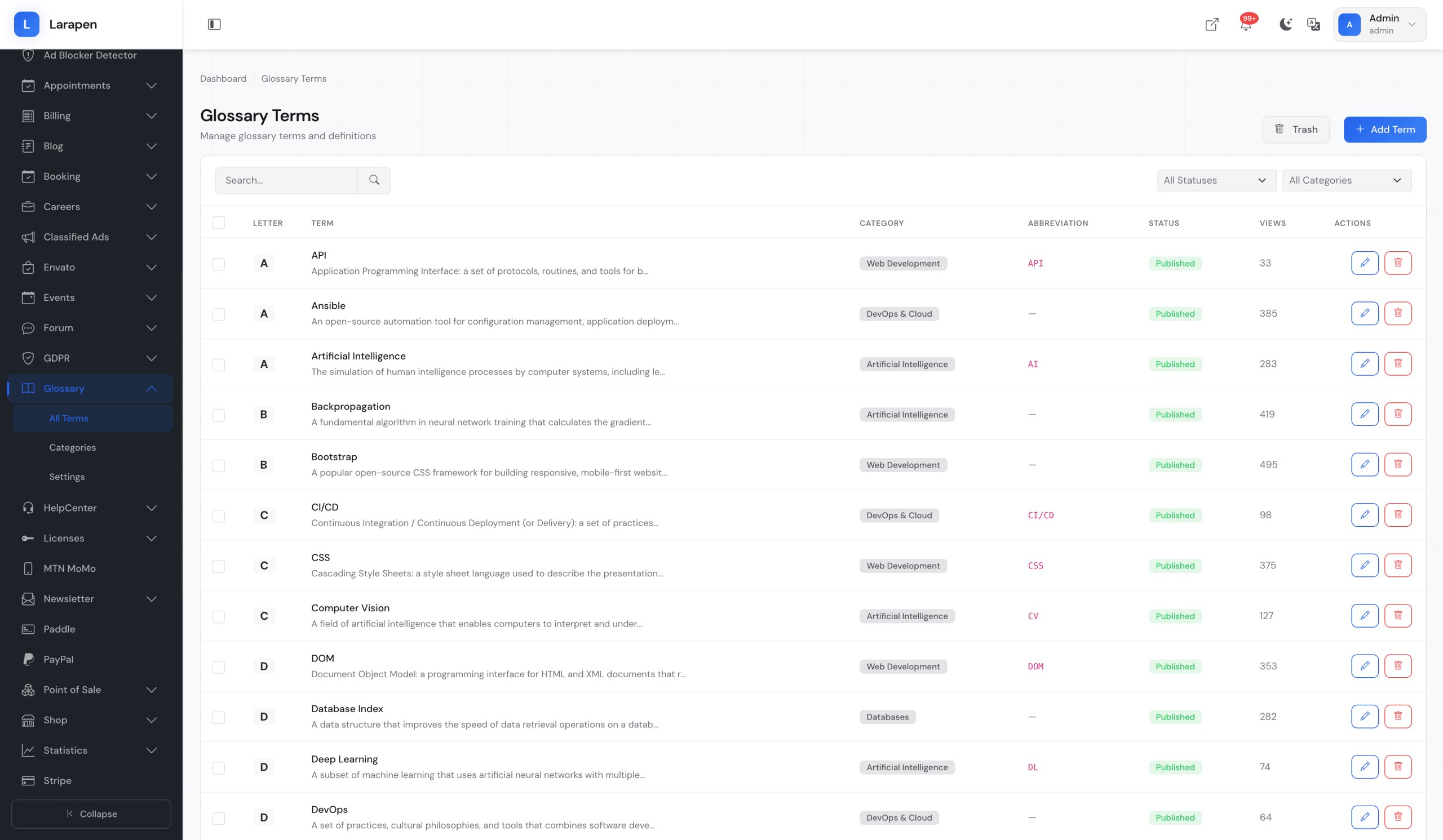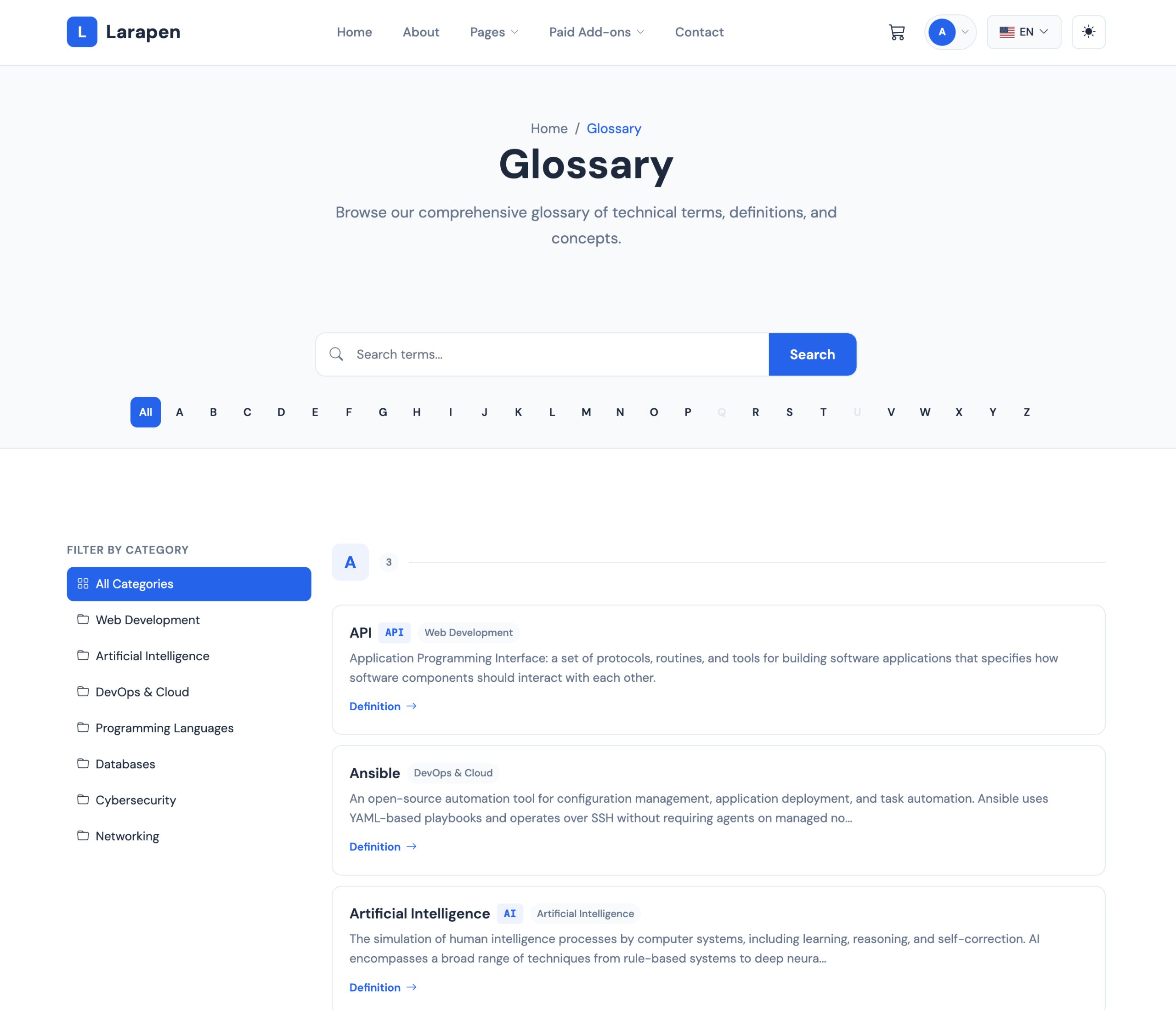 Le module Glossaire vous permet de créer une référence terminologique complète directement sur votre site Larapen. Chaque terme obtient sa propre page dédiée avec une définition riche, en faisant un atout SEO puissant. Les moteurs de recherche adorent le contenu bien structuré et riche en mots-clés, et un glossaire fournit exactement cela. Au fil du temps, vos pages de glossaire attirent du trafic organique.
