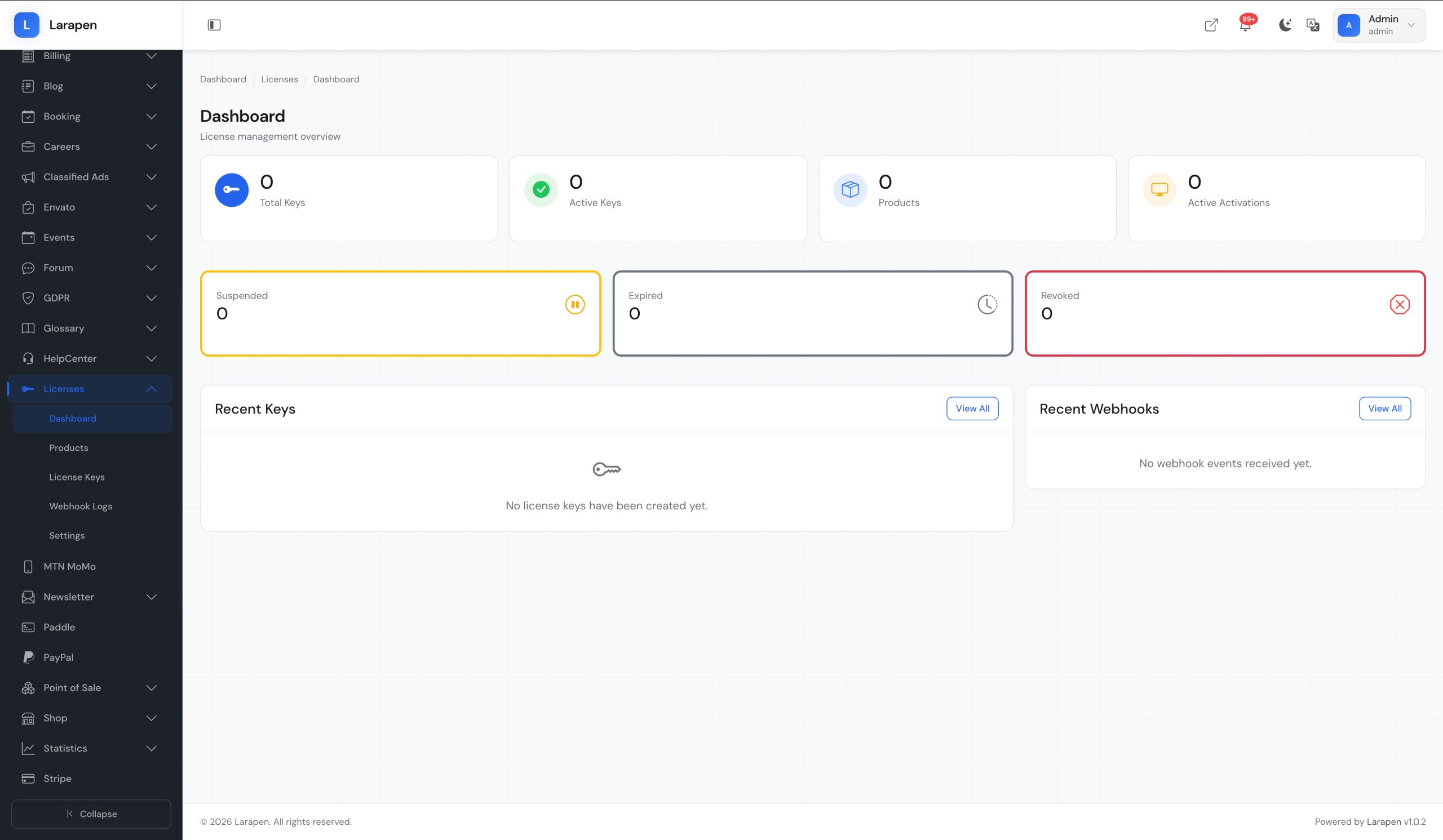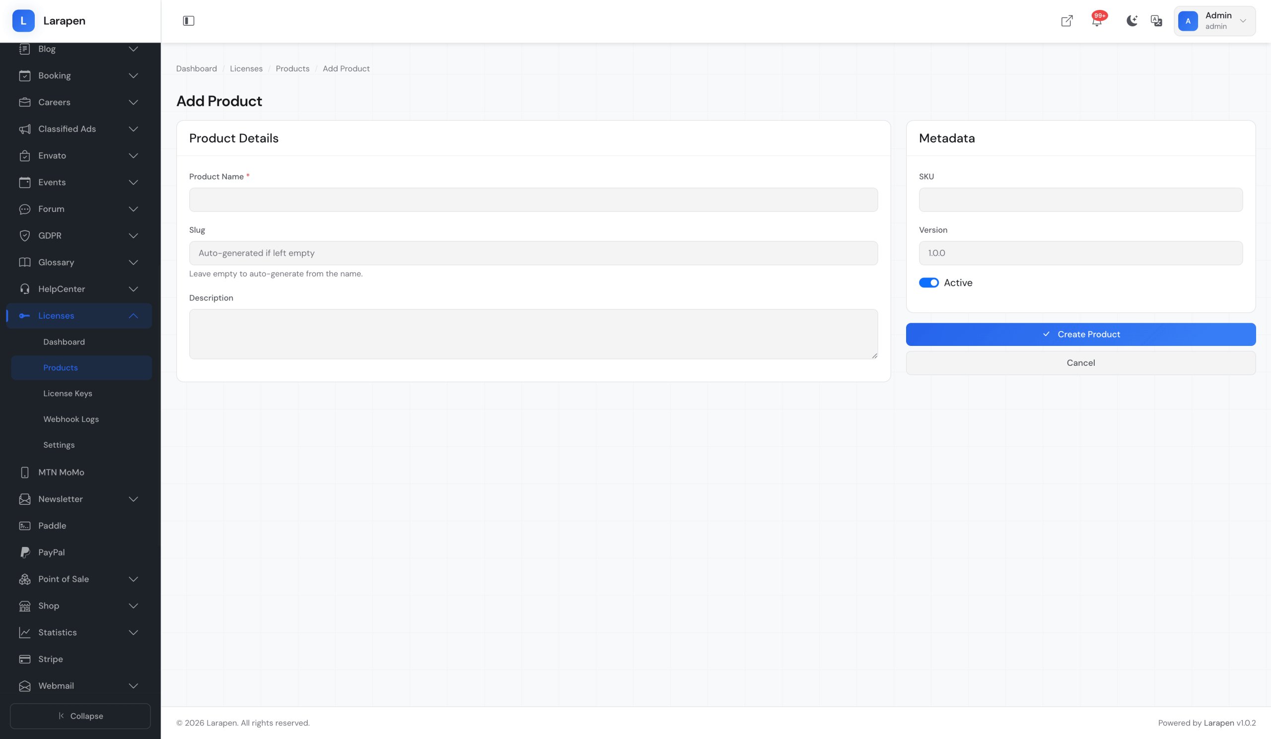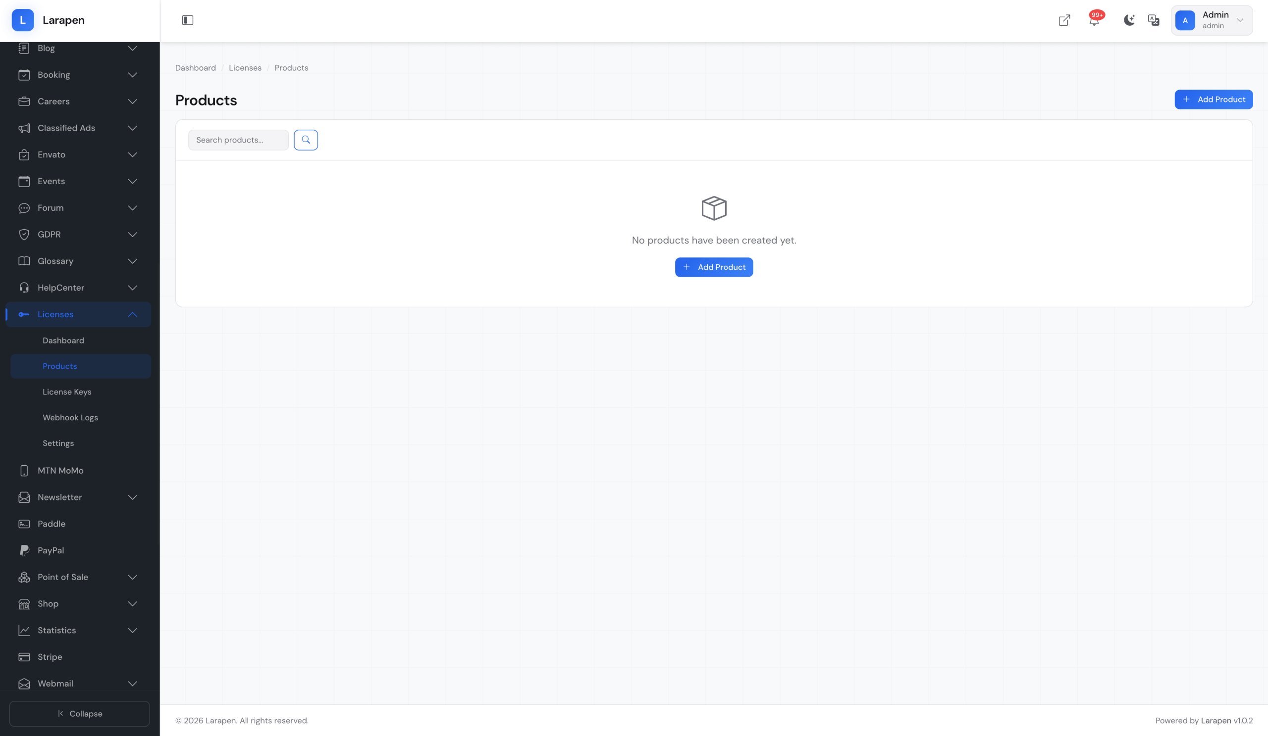 Créez vos produits logiciels et plans de licence dans le panneau d'administration. Définissez le nombre d'activations autorisées, la période de validité et si la liaison au domaine est requise pour chaque plan.