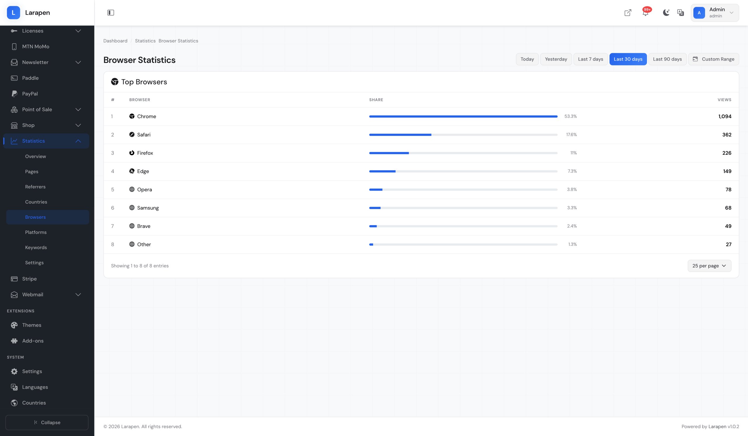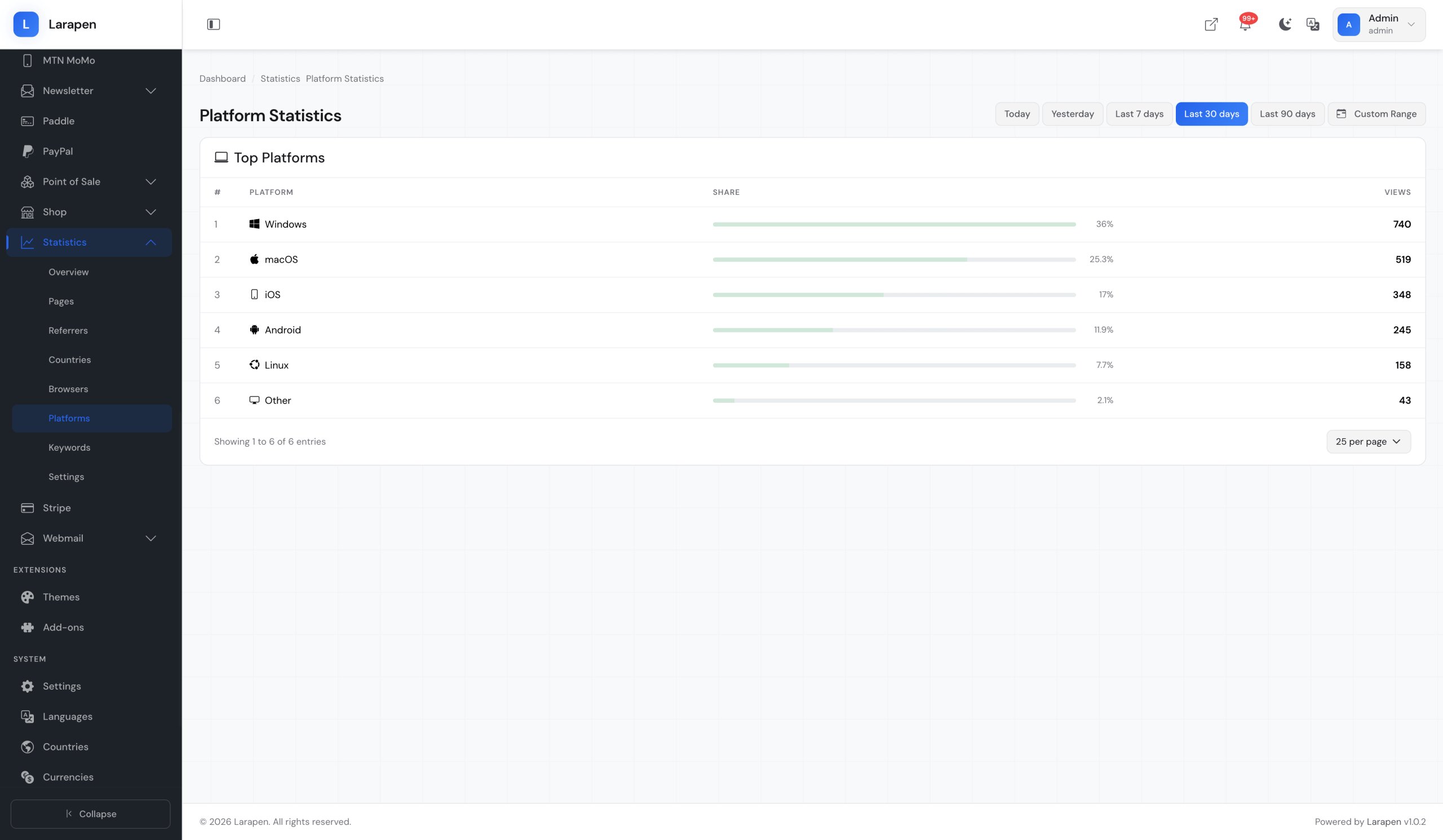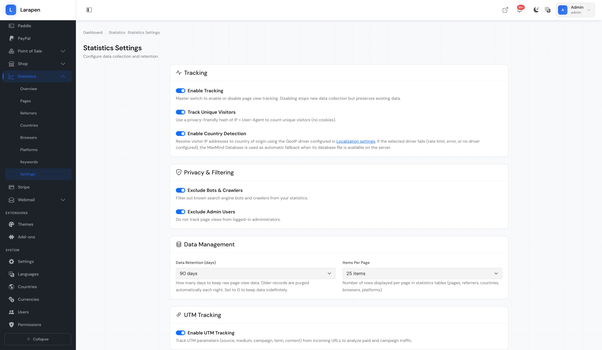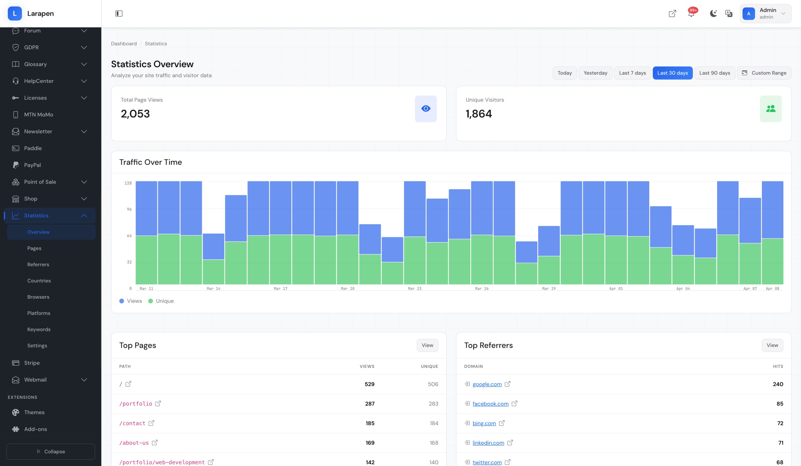 La plupart des outils d'analyse envoient les données de vos visiteurs à des serveurs externes appartenant à des entreprises de technologie publicitaire. Le module Stats de Larapen adopte une approche différente : toutes les données restent sur votre propre serveur. Vous obtenez les informations dont vous avez besoin: pages vues, visiteurs uniques, sources de trafic, contenu populaire et répartition des appareils; sans donner les données de votre audience à des tiers. Pas de cookies de suivi, pas de suivi inter-sites, pas de bannière de consentement requise dans la plupart des juridictions. Juste des métriques propres et utiles stockées dans votre propre base de données.