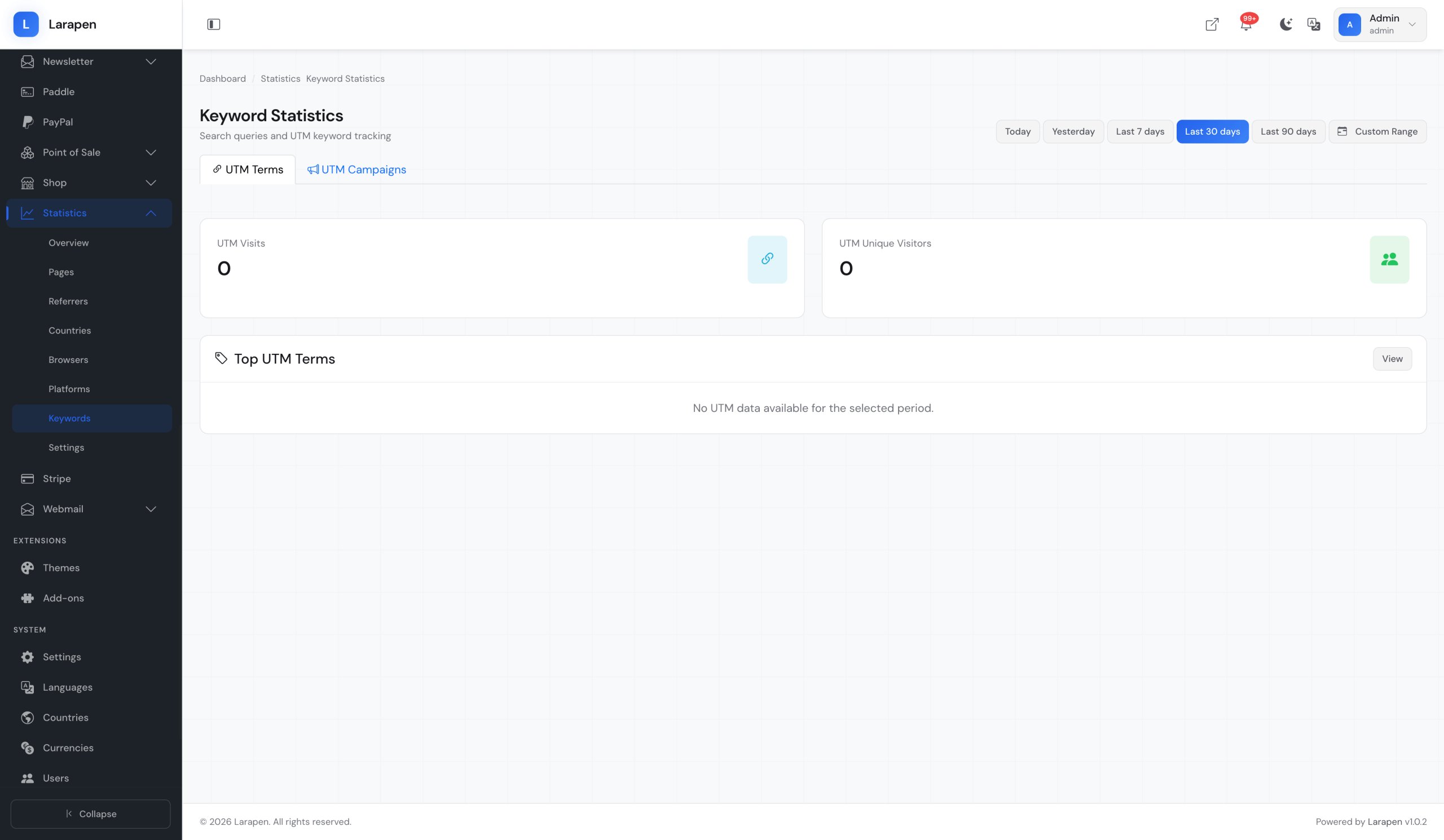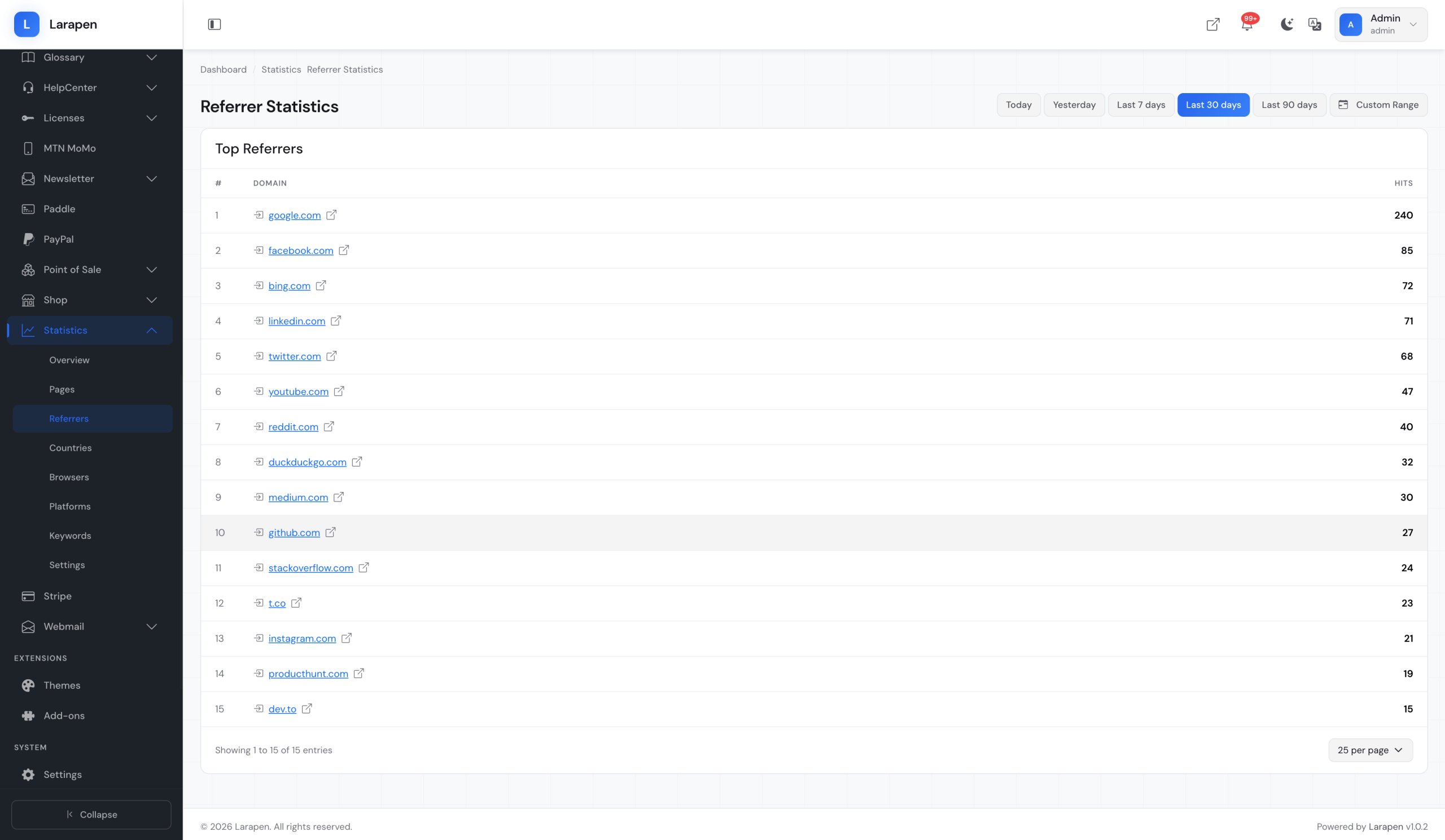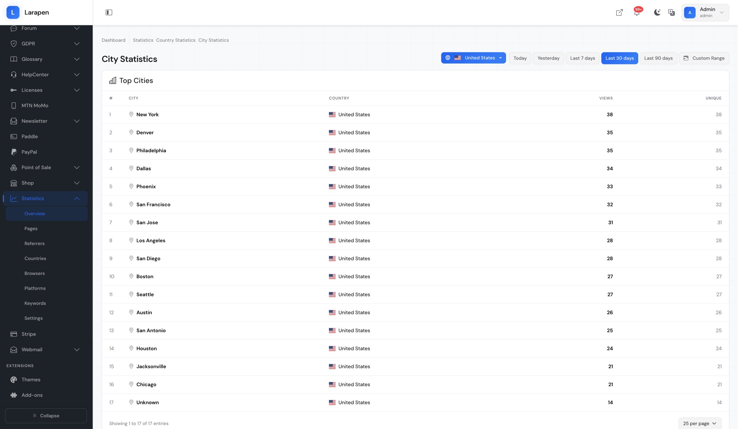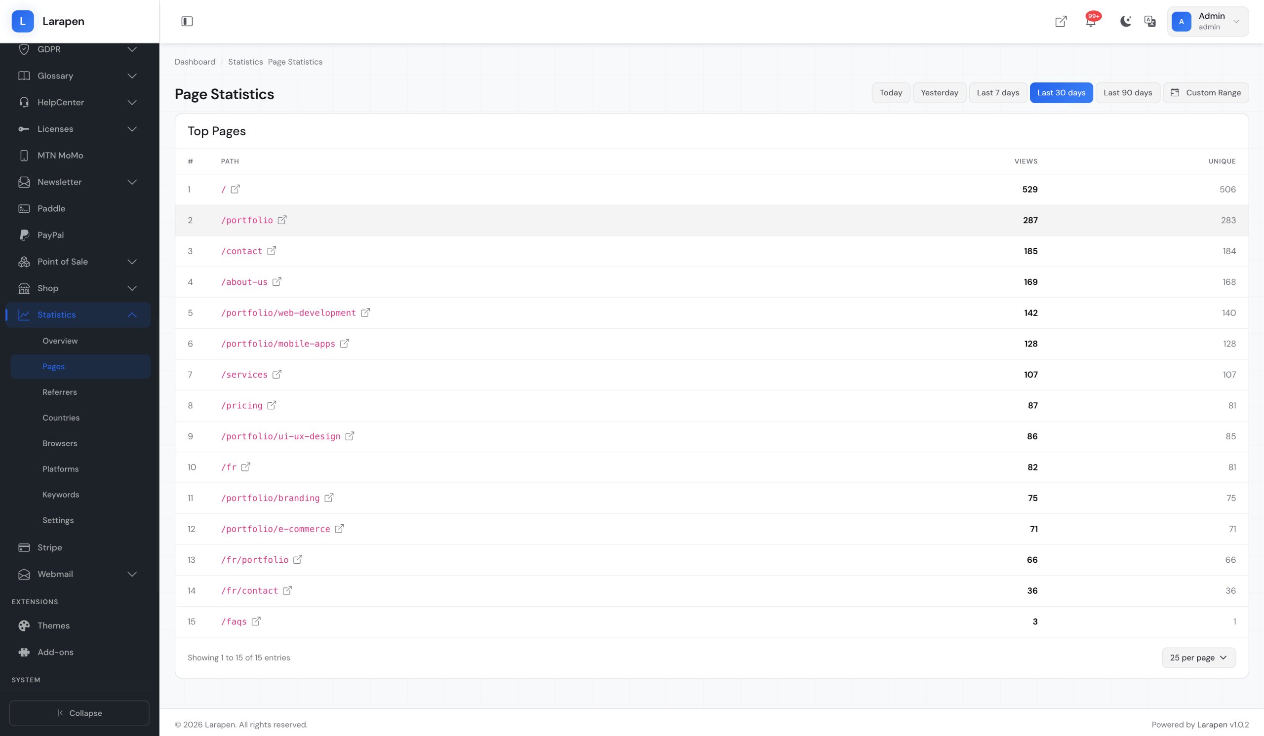 La plupart des outils d'analyse envoient les données de vos visiteurs à des serveurs externes appartenant à des entreprises de technologie publicitaire. Le module Stats de Larapen adopte une approche différente : toutes les données restent sur votre propre serveur. Vous obtenez les informations dont vous avez besoin: pages vues, visiteurs uniques, sources de trafic, contenu populaire et répartition des appareils; sans donner les données de votre audience à des tiers. Pas de cookies de suivi, pas de suivi inter-sites, pas de bannière de consentement requise dans la plupart des juridictions. Juste des métriques propres et utiles stockées dans votre propre base de données.