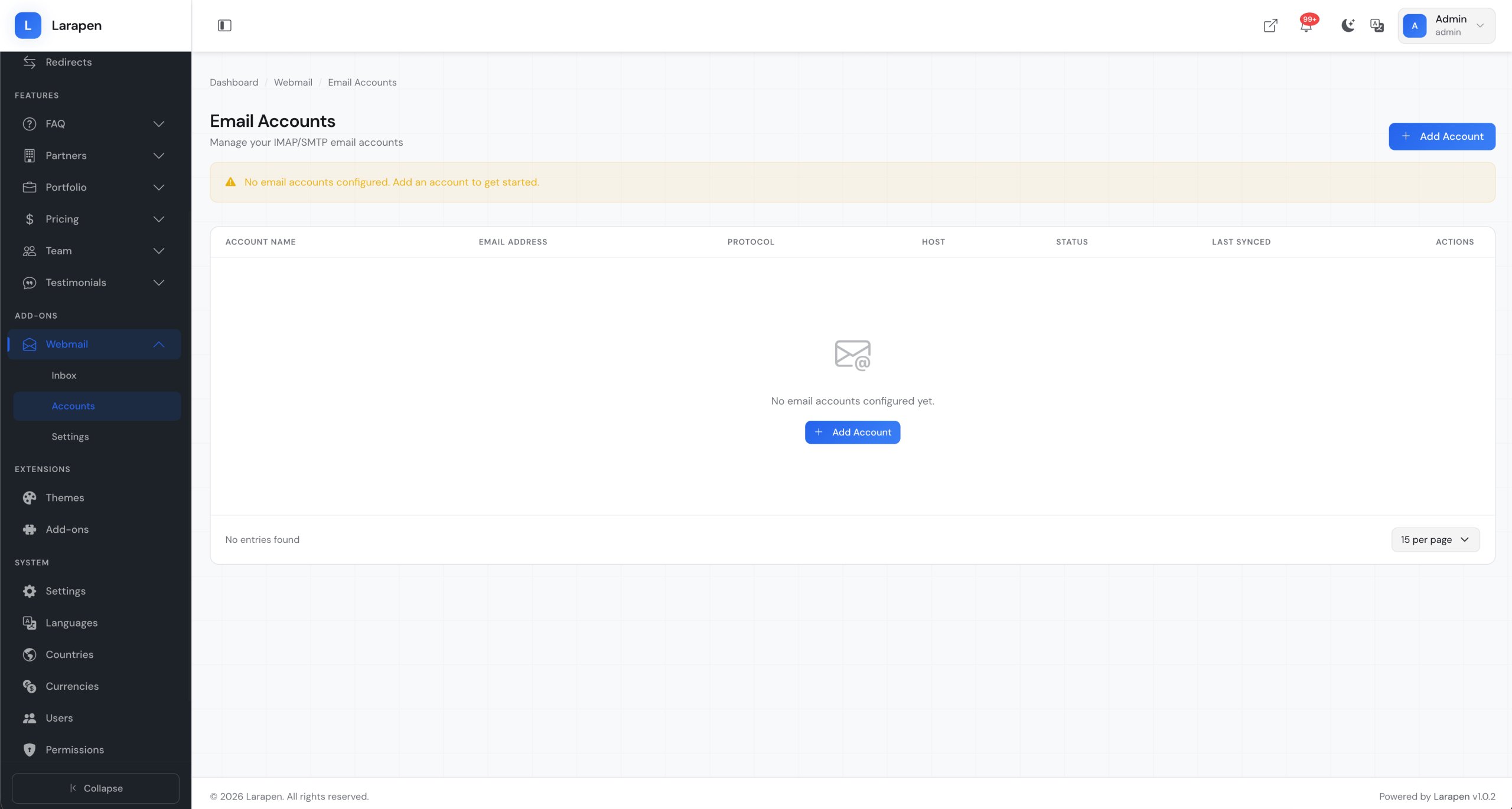 Un client email intégré pour votre panneau d'administration. Lisez, composez, répondez et gérez les emails de plusieurs comptes sans quitter votre tableau de bord Larapen.