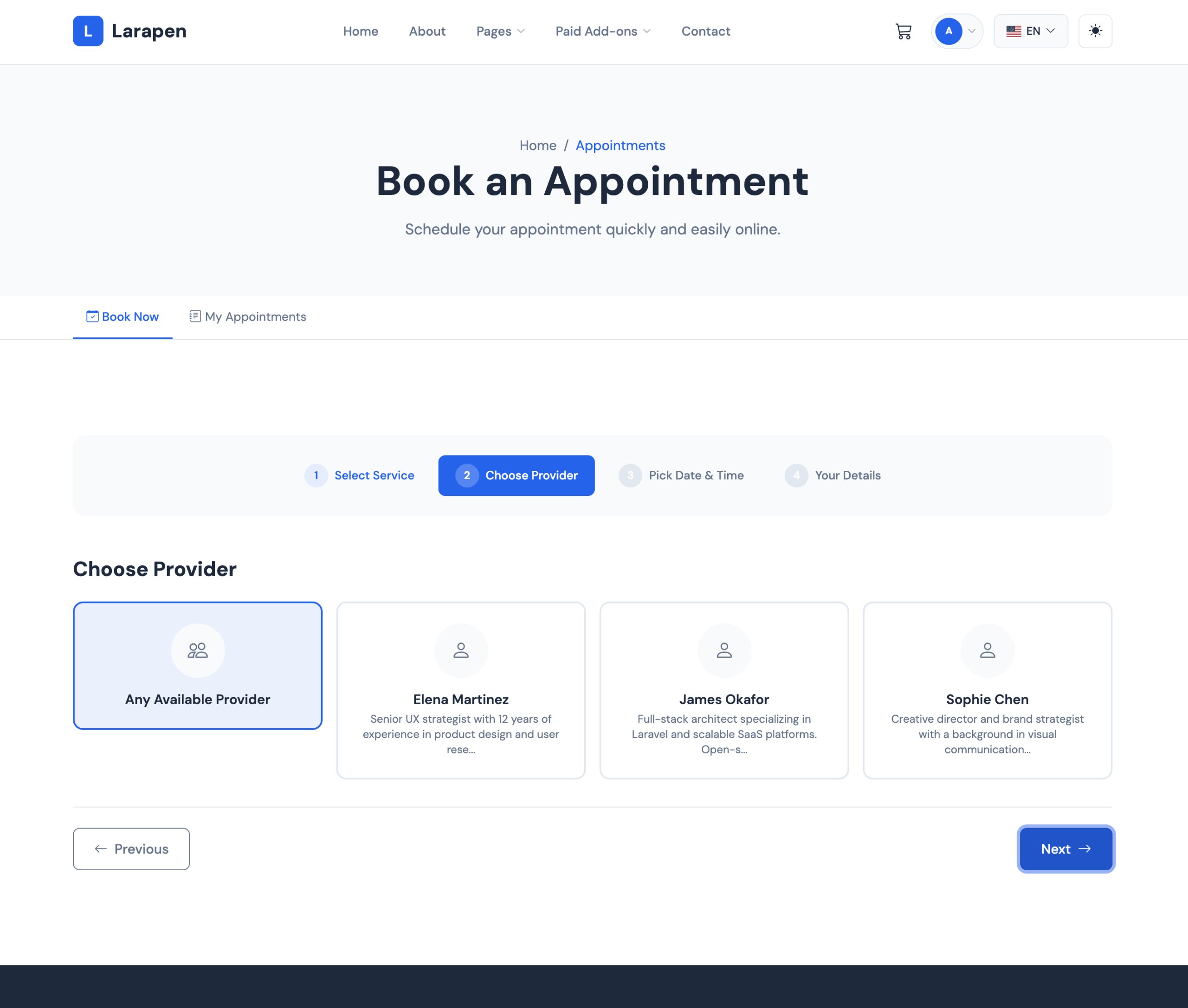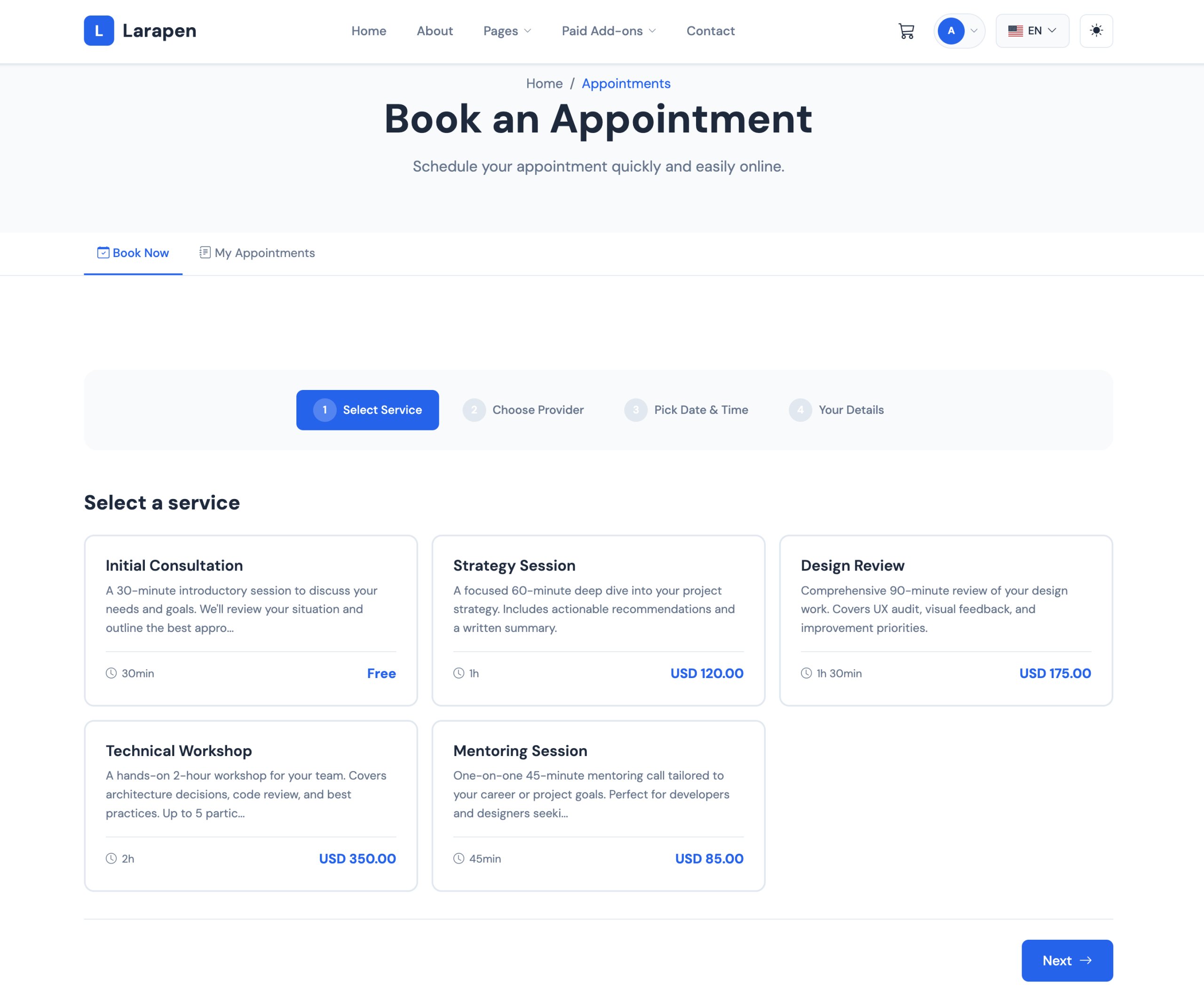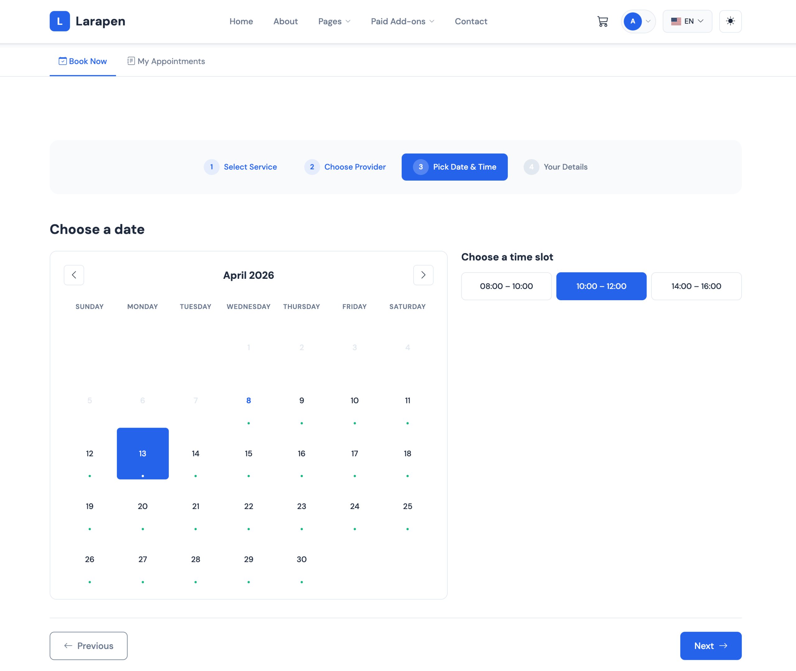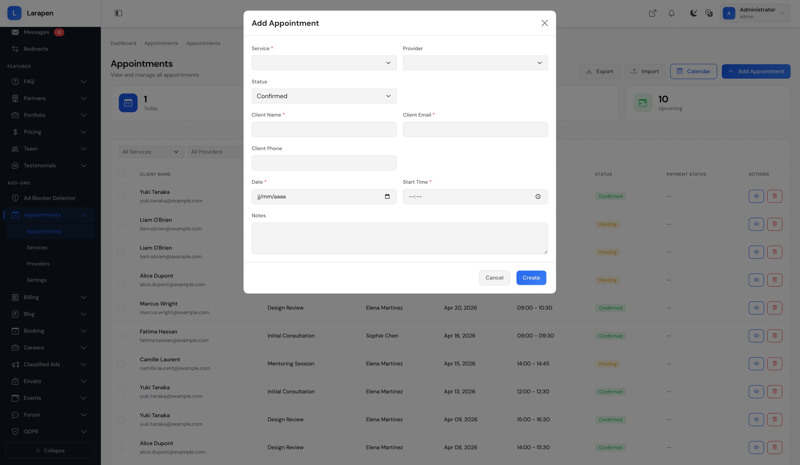 Let clients book appointments and services directly on your website. Manage availability, time slots, confirmations, and reminders. All from your Larapen admin panel.